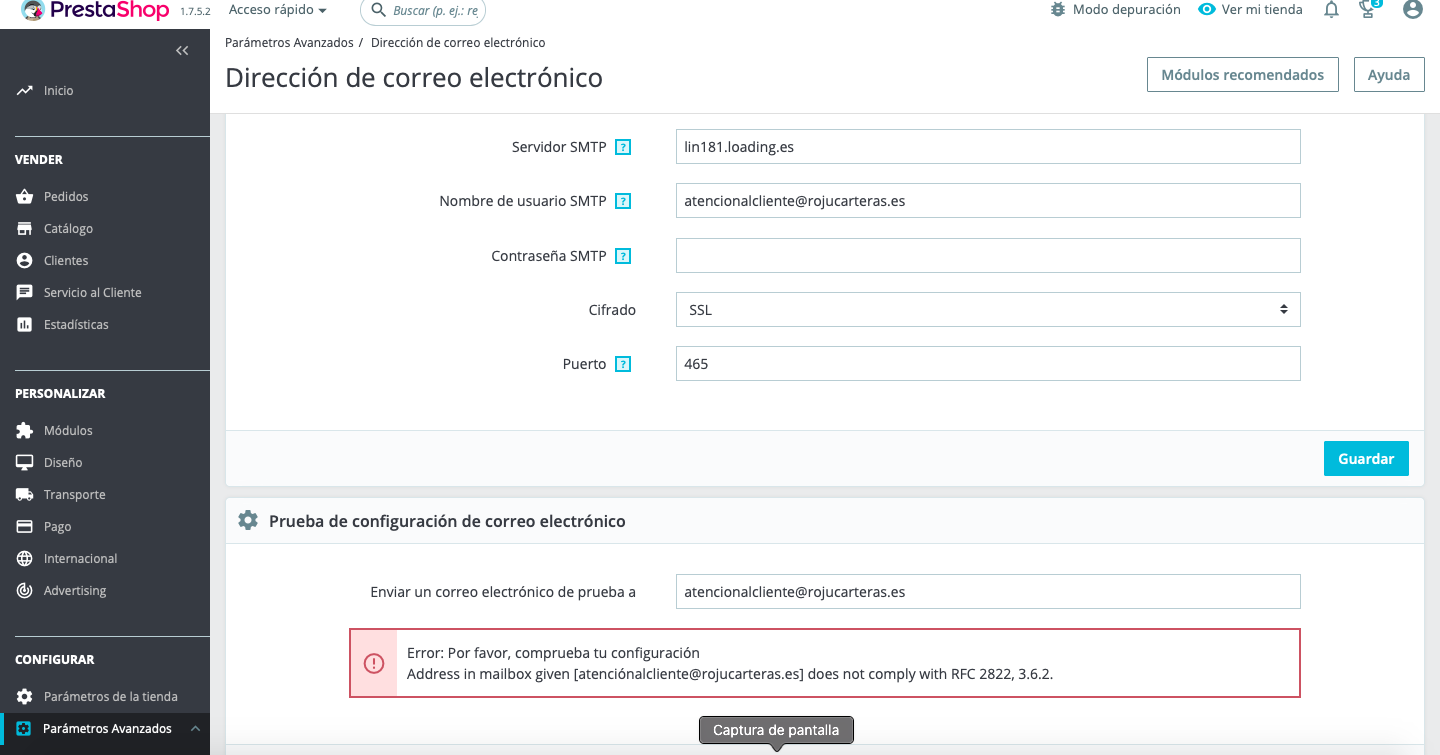 Llevo varios dias intentando configurar el correo electrónico y me da error, pedí los datos del servidor SMTP a mi proveedor de hosting pero me da error, no se envían correos cuando se suscriben al newsletter, ni cuando se hacen la cuenta de cliente ni puedo enviar el email de prueba.
