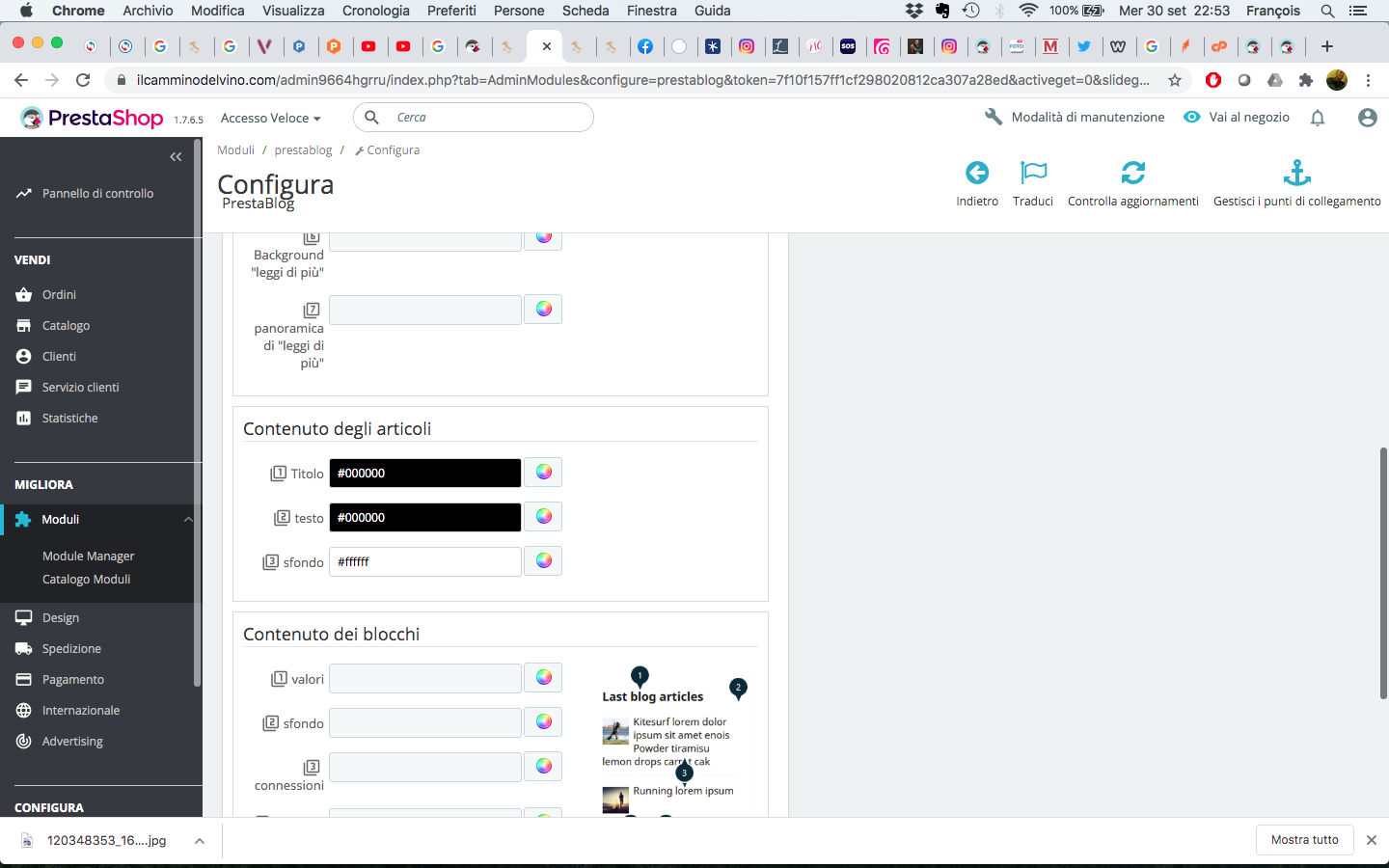 Jean François Moussa Posted September 30, 2020 Share Posted September 30, 2020 Buongiorno, Sto impazzendo per cercare di modificare il colore del titolo dei miei articoli su Prestablog. Per default il blog rende l'intero articolo in bianco su sfondo bianco, quindi non si vede (immagino questo problema sia dato dal fatto che il mio sito, al contrario della maggior parte dei siti è su sfondo nero). Essendoci i pulsanti per modificare le caratteristiche del testo principale, posso modificare il colore di quest'ultimo ma non del titolo. Ho provato anche andando a modificare colore testo e colore sfondo in CONFIGURAZIONE - DESIGN, ma qualunque modifica faccia poi nel front office non cambia niente. Potete aiutarmi? Versione di PrestaShop: 1.7.6.5 Link to comment Share on other sites More sharing options...