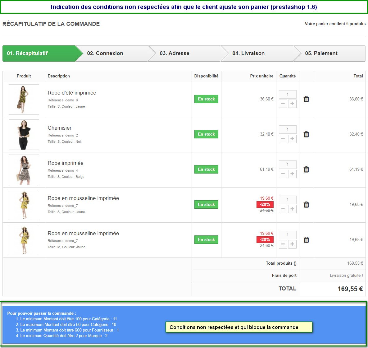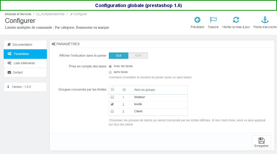 Fernand WAFO Posted October 4, 2020 Share Posted October 4, 2020 (edited) Vous pouvez créer plusieurs règles pour limiter les commandes selon les quantités ou montant minimum et maximum et par catégorie, par groupe, marque ou fournisseur. Vous avez des produits à vendre selon des quantités minimum ou maximum des catégories, des marques ou des fournisseurs? Vous souhaitez vendre uniquement sous au-moins un montant minimum ou maximum des catégories, des marques ou des fournisseurs?. Ce module vous permet de définir des règles multiple de limitation d'une commande votre boutique. Ainsi, vous pouvez par exemple définir : Fixer une quantité minimum et une quantité maximum pour une catégorie X (et vous pouvez le faire pour plusieurs catégories différemment) Fixer un montant minimum et un montant maximum pour une catégorie X (et vous pouvez le faire pour plusieurs catégories différemment) Fixer une quantité minimum et une quantité maximum pour une marque X (et vous pouvez le faire pour plusieurs marques différemment) Fixer un montant minimum et un montant maximum pour une marque X (et vous pouvez le faire pour plusieurs marques différemment) Fixer une quantité minimum et une quantité maximum pour un fournisseur X (et vous pouvez le faire pour plusieurs marques différemment) Fixer un montant minimum et un montant maximum pour une marque X (et vous pouvez le faire pour plusieurs fournisseurs différemment) Fixer une quantité minimum et une quantité maximum pour une liste de produits sélectionnés (et vous pouvez le faire pour plusieurs listes différemment) Fixer un montant minimum et un montant maximum pour une liste de produits sélectionnés (et vous pouvez le faire pour plusieurs listes différemment) Et pour chaque cas, vous pouvez choisir juste certains clients sur lesquelles la condition peut s'appliquer. Pour un panier, vous pouvez définir autant de conditions que vous voulez. Un exemple concret pour une boutique qui vend des stylos de 2 fournisseurs A et B, des chemises de marques Adidas et Puma, des pantalons de la marque adidas, des tasses et plusieurs autres produits. Le marchand peut par exemple définir ceci (ensemble) : Les stylos du fournisseur A se commandent uniquement pour aumoins 100 pièces Les stylos du fournisseur B se commandent au trop pour 1000 pièces Les produits de la catégorie "Tasses" se vendent pour des montants compris entre 100€ et 500€ La marque Adidas se commandent pour au moins 100€ (donc un client peut prendre des chemises pour 60€ et des pantalons pour 40€ mais de la même marque adidas) La marque puma se vend en quantité minimum de 30 pièces. Le module est disponible sur addon : ICI (https://addons.prestashop.com/fr/inscription-processus-de-commande/44386-limites-multiple-de-commande-selon-plusieurs-criteres.html) Edited October 4, 2020 by Fernand WAFO Ajout lien et tag (see edit history) Link to comment Share on other sites More sharing options...