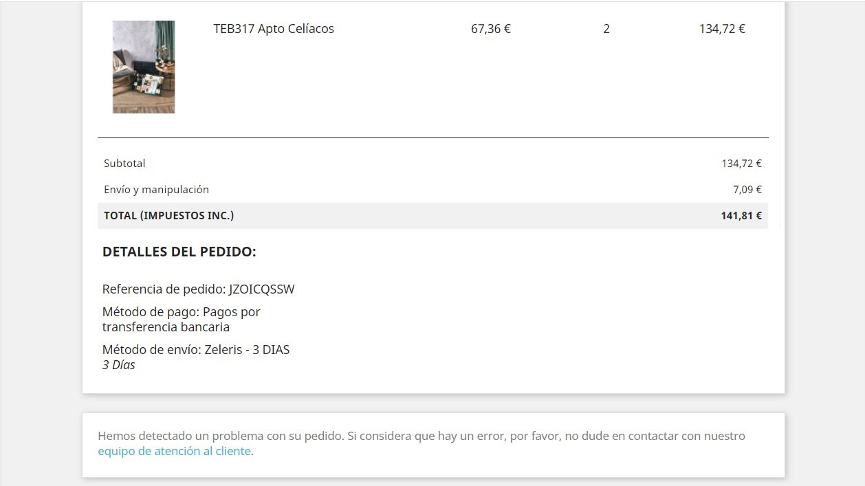 Ocul Posted October 9, 2020 Share Posted October 9, 2020 (edited) Buenas!! PS 1.7.6.8 Estoy realizando pruebas de pedidos para dejar la tienda ya en orden y me aparece este mensaje en la página de confirmación de pedido : Hemos detectado un problema con su pedido. Si considera que hay un error, por favor, no dude en contactar con nuestro equipo de atención al cliente. En principio todo esta ok. A qué se debe este mensaje?' Al cliente no le va gustar seguro.... Gracias, un saludo!!! Edited October 21, 2020 by Ocul Solucionado (see edit history) 1 Link to comment Share on other sites More sharing options...