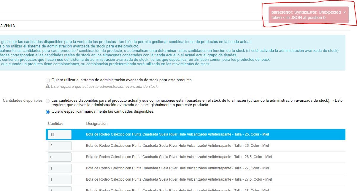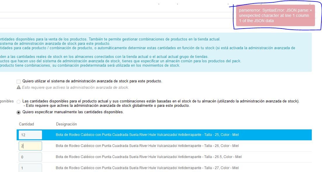 I use prestashop 1.6.24, I have had it for quite some time and have had no problem with it. I use google chrome and tried to change it in firefox and got a different error which is the picture with the blue square that says "parsererror: SyntaxError: JSON.parse: unexpected character at line 1 column 1 of the JSON data"