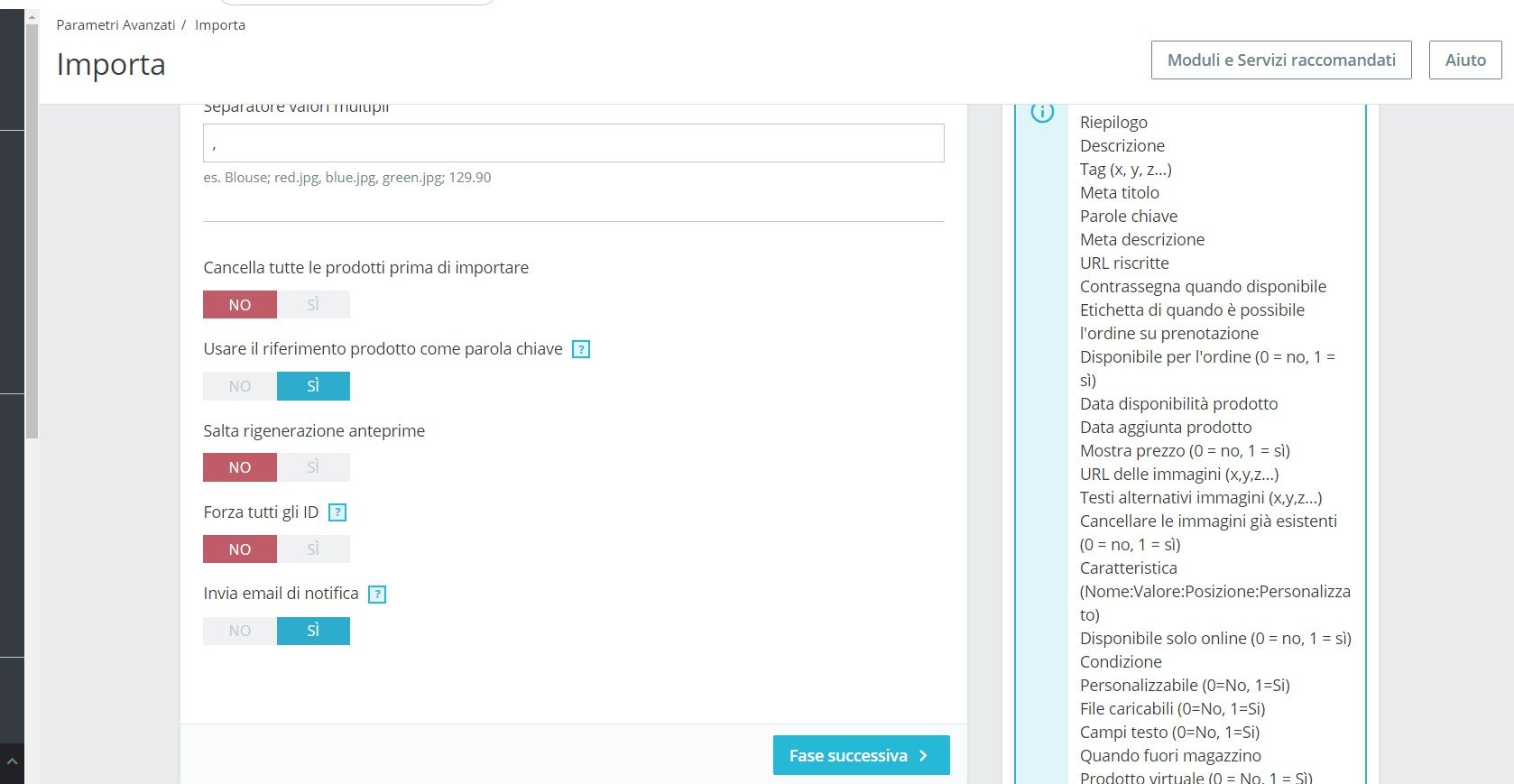 Kewhyn Posted October 12, 2020 Share Posted October 12, 2020 (edited) Buongiorno a tutti, ho un problema con la versione 1.7.6.8. Quando importo un file per l'aggiornamento massivo della quantità, Prestashop non si limita ad aggiornare le quantità dei prodotti esistenti di cui trova riferimento prodotto, ma mi aggiunge a catalogo anche tutti gli altri. Nella versione 1.6 non ho mai avuto questo problema, ogni volta che importavo un file mi venivano aggiornati solo i prodotti con corrispondenza e gli altri li ignorava. Invece adesso mi crea prodotti anche dove non c'è corrispondenza con riferimento prodotto. Il file che importo contiene solo i campi "riferimento" e quantità". Ovviamente ho attivato il riferimento prodotto come parola chiave, così come facevo nella precedente versione... Cosa sbaglio? c'è una procedura diversa nella 1.7 per l'aggiornamento massivo delle quantità? Edited October 12, 2020 by Alessandro2015 (see edit history) Link to comment Share on other sites More sharing options...