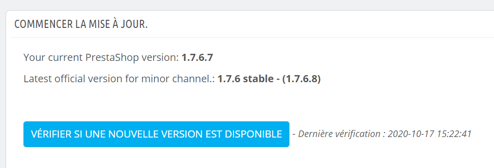 azer Posted October 16, 2020 Share Posted October 16, 2020 Version de PS : 1.7.6.7 Thème (défaut/perso) : Classic (modifié) Hébergement : OVH Version de PHP : 7.3 Bonjour, souhaitant mettre ma boutique 1.7.6.7 à jour vers la version proposé par le module natif "1-Click Upgrade" (1.7.6.8) je me suis assuré que les points de la liste de vérifications soient au vert (sauf les deux derniers qui sont avec un triangle jaunâtre dont le statut peut être ignoré) j'ai donc 8 points de la liste qui sont en vert sur les 10 (boutique mise en maintenance et cache désactivé). Your current PrestaShop version: 1.7.6.7 Latest official version for minor channel.: 1.7.6 stable - (1.7.6.8) - Dernière vérification : 2020-10-16 19:00:27 Je clique sur "VERIFIER SI UNE NOUVELLE VERSION EST DISPONIBLE" ça détecte bien une nouvelle version puis plus rien. Le bouton interactif qui permet la mise a jour ne pointe pas le bout de son nez.. J'avais réussi la maj de 1.7.6.5 vers 1.7.6.7, mais là ça veut pas. Savez vous que faire ? Link to comment Share on other sites More sharing options...