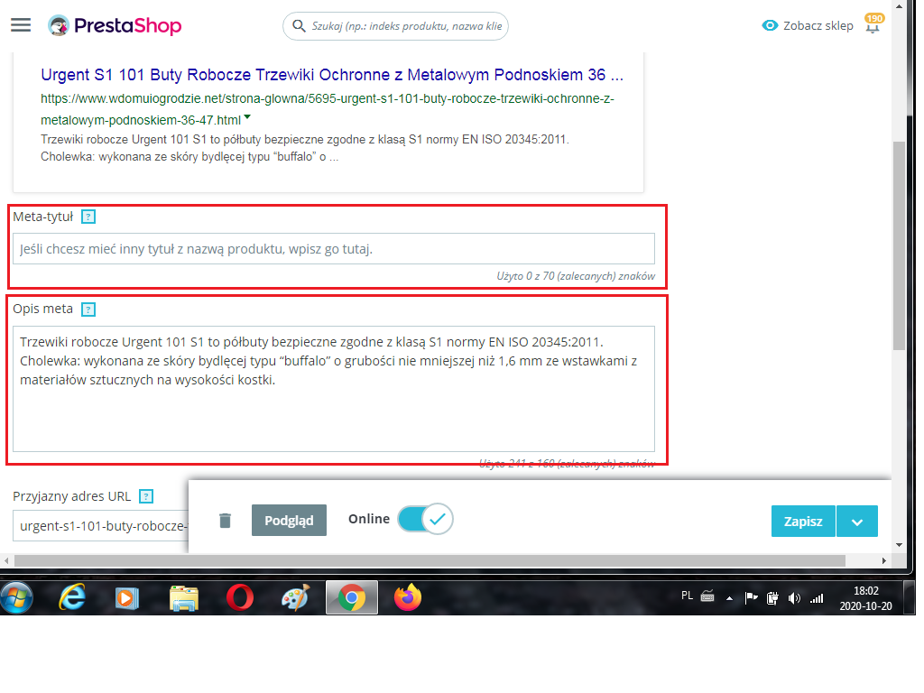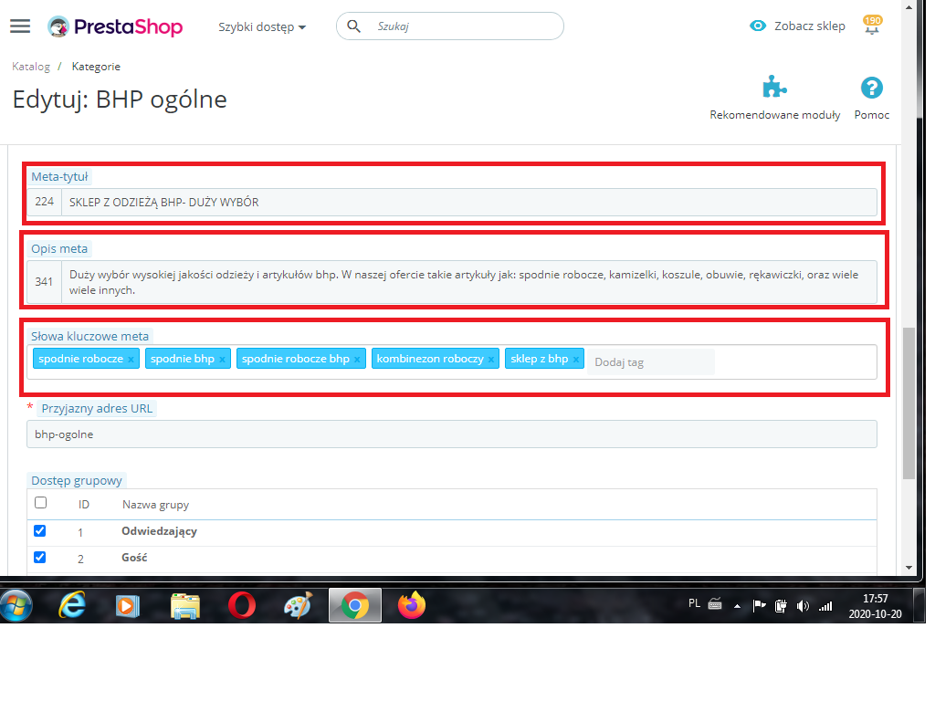 wdomuiogrodzie Posted October 20, 2020 Share Posted October 20, 2020 Witam, moja prośba o pomoc skierowana jest do specjalistów od prestashopu, a mianowicie mam pytanko czy warto uzupełniać zaznaczone przeze mnie na czerwono pola meta, czy ma to znaczenie dla seo i pozycjonowania zarówno w stronach kategorii, oraz produktów, pytam ponieważ gdy uzupełniłem pole meta tytuł pod tytułem: "SKLEP Z ODZIEŻĄ BHP- DUŻY WYBÓR" Po wpisaniu w wyszukiwarkę google niestety pod tym tytułem nie wyświetla się moja strona na żadnej pozycji. Proszę w miarę możliwości o pomoc i jakąkolwiek informację z góry serdeczne dzięki. Link to comment Share on other sites More sharing options...