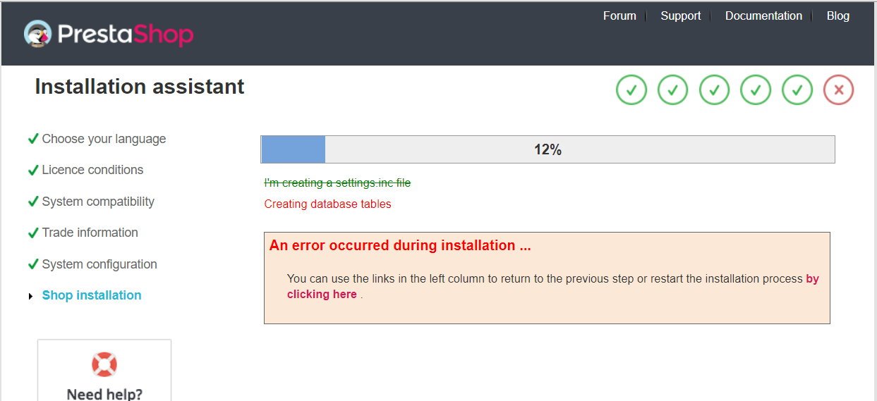 You can use the links on the left column to go back to the previous steps, or restart the installation process by clicking here.