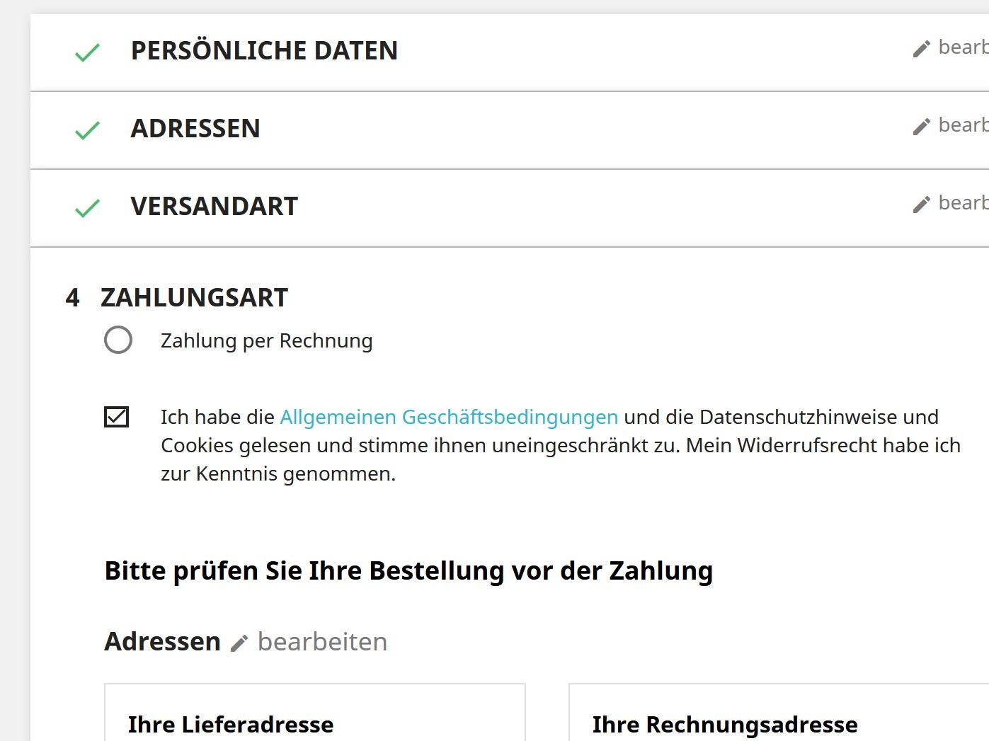 Ich habe die [Allgemeinen Geschäftsbedingungen] des Anbieters gelesen und erkläre mit dem Absenden der Bestellung mein Einverständnis. Mein [Widerrufsrecht] habe ich zur Kenntnis genommen.