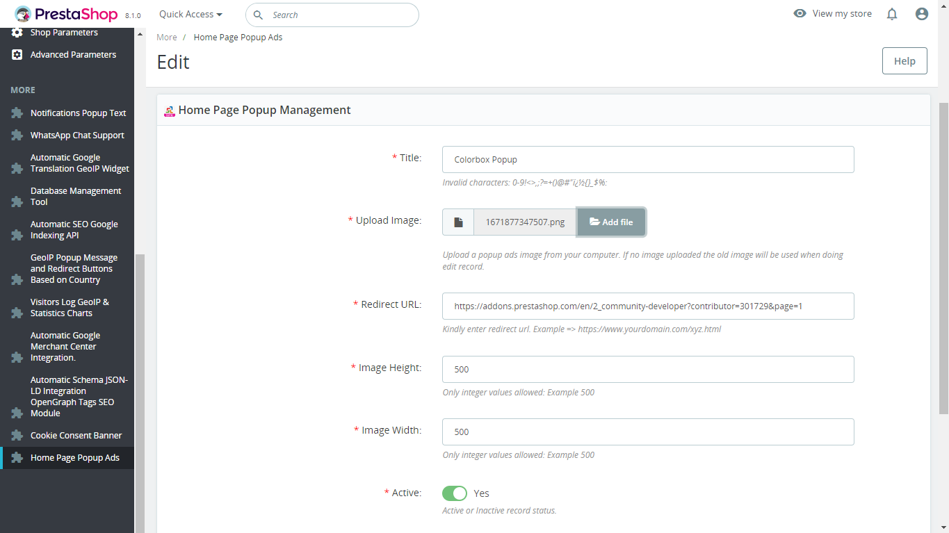 Zohaib-fk Posted October 23, 2020 Share Posted October 23, 2020 (edited) Hi All, Greetings of the day. The module helps to add popup image ads on the home page related to products, offers, promotions, etc & showcase them in the front office using interactive popups. Numerous studies show that conversion rates increase remarkably with the use of pop-ups. It is a unique way of commanding attention; a well-designed and well-written pop-up can be a real boon to your company’s lead generation. Pop-ups can be useful and a great asset when used properly. Pop-up banners are also extremely durable. This helps to increase sales, and customer attention on various festival offers like Christmas offers, Black Friday offers Good Friday, Thanks Giving Day, Marketing, Sales, etc. Visibility. One obvious advantage is its visibility. It’s the first thing that visitors see when they go to your site. It immediately catches their attention. The manner in which you design your pop-up can dictate though if they will take the bait or not. Increase in traffic conversion. Studies have shown that pop-ups are 13 times more effective at generating clicks and opt-in subscribers than standard banners. Features : - Facility to add multiple pop-up ads from back-office Dates and popup images. - Search facility in back-office. - Products offers and promotions in front office in an interactive way. - Showcase products. - SEO-friendly. - Support all browsers: Firefox, Chrome, IE, Safari, etc. - Lightweight. (Smaller file size which loads faster.) - Increase sales, conversion rates, and product promotions. - Maintain existing customers and attract new customers. - Lower marketing expenses, exposure to potential customers, and reach targeted audiences. - Compatible with PrestaShop 1.6.x,1.7.x,8.x.x - Multiple browsers compatibility(IE, Firefox, Opera, Safari, Chrome, and Edge). - Mobile, Tablet, and all devices compatible. - Module works without doing any change in existing files on PrestaShop store versions. - 24*7 Support - Good Documentation Benefits for Customer : - Customers trust your products & services. - Maintain existing customers and attract new customers. - Increase in sales and store traffic. - Lower marketing expenses, exposure to potential customers, and reach targeted audiences. Installation : Step 1: Upload the module zip file from the back-office Module & Services menu tab. Module Manager area using the upload button. After the successful installation module menu, the link will appear in the left menu or top menu in the back-office area. Step 2: Install the module using the install button. Step 3: Visit the module management page from the back-office "More" area (section) in the left menu in the back-office. Step 4: The module installation process is very easy, how module configuration works can be seen in the demo instance. Step 5: Please visit our demo instance for module configuration and usage demo. Step 6: Please watch our YouTube channel for demo videos on the module, how to use and configure on the website. - Module works without making any change in the existing PrestaShop file so that existing customization and theme change do not affect. - We provide free technical and feature support in installation, and configuration, as well as access to updates available for this product. - Free support on installation, configuration, and customization as per store requirements, for example, new hook addition to your store Other : Please leave your valuable feedback after using the module. This will help to increase self-confidence, improve service, and enhance the module as per requirements to make it better for different online stores. Request: Please share your website URL after using the module to help others see how the module works on your website. Download Module and Documentation Please note only the free module will send an email to a developer with only a website link to know the module is installed successfully and working fine. This is to know module working fine and do future improvements and enhancements inside the module. Customer's success is our satisfaction. readme_fr.pdf readme_en.pdf Demo URL => https://www.presta-addons-modules.com/en/ Pay any amount as per your choice to get the multi-languages,multi-shops, and multi-shop-groups feature in the free addon sfkpopup.zip Edited January 30, 2025 by Zohaib-fk Post Updated for screenshot & new features information (see edit history) 3 3 Link to comment Share on other sites More sharing options...