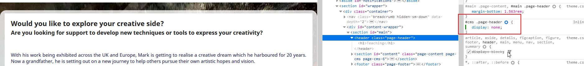 camman2112 Posted October 26, 2020 Author Share Posted October 26, 2020 (edited) Thank you! I've installed a custom CSS editor module and managed to remove the breadcrumbs. I haven't been able to change the background image though. I'm not able to access the assets folder and I don't want to have to pay a lot for a module in order to change it. Perhaps I could email the server owner instead and get them to do it. Lastly, do you know how I can remove page headers? I tried: Quote #cms .page-header { display: none; } But it doesn't work. Thanks again! I'm trying to get rid of titles like 'Teaching', e.g. https://marknoble.art/content/6-teaching Edited October 26, 2020 by camman2112 (see edit history) Link to comment Share on other sites More sharing options...
