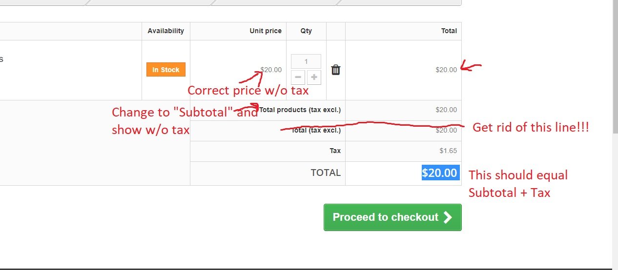 HTown_Loki Posted October 25, 2020 Share Posted October 25, 2020 Ok. I'm in the United States. In Texas to be precise. I want to charge 8.25% on all items sold. (Pic included to hopefully better explain). On the product page, I want nothing mentioned of taxes. I just want the unit price listed. When you go to check out I want the unit price, again, to be listed with out taxes. In the item total (if you purchase more than one), I want it to be quantity X unit price. This is displaying correctly. Where it says "Total products (tax excl.)" I want it to JUST say "Subtotal". This should add the total amount in the cart again without any taxes added to it. The line that says "Total (tax excl.)" I want to completely disappear from this page. Next is the "Tax" line. This DOES display the correct tax amount that I need to collect for the state. The problem is in the next line. The line listed as TOTAL is where I want to display the total amount of all things in the cart PLUS the tax amount. I've tried all configs settings I find online. All either add the tax in the areas I don't want the tax or assumes that I included the tax in the pricing of the item. Neither of which is true. I've been at this for way to long. If I have to put in code, PLEASE tell me where and show me a reference that I can cut and paste. (I've done HTML and css, but never php.). I see a lot of folks have this issue, but the resolves still don't display how I'm wanting. PrestaShop 1.6.1.24 Link to comment Share on other sites More sharing options...