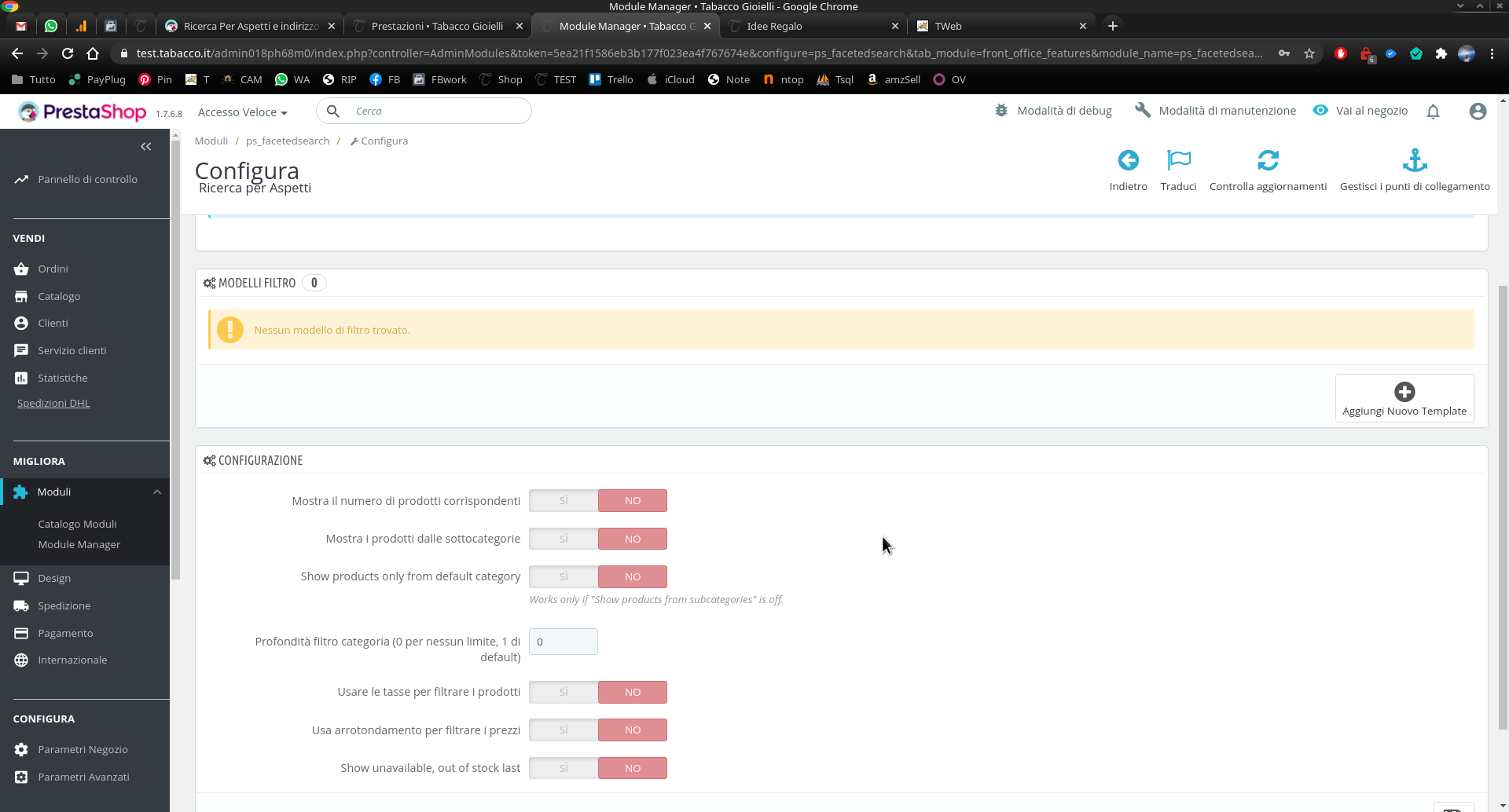 GiordanoFuretto Posted October 27, 2020 Share Posted October 27, 2020 So che la cosa potrà sembrare priva di senso...ma è cosa mi succede sul mio store. Prestashop 1.7.6.8 PHP 7.2.34 Se ABILITO la ricerca per aspetti (faceted search) e faccio il login nel frontend impostandomi come indirizzo spedizione Stati uniti, o san marino o comunque qualsiasi non EUROPEO) posso vedere i prodotti, ma TUTTE le categorie mostrano zero prodotti, come se fossero vuote. nella ricerca per aspetti vedo il numero di articoli ma non li visualizzo. Disabilitando ricerca per aspetti, funziona tutto. Ho provato tutte le varie impostazioni del modulo, prima di tutto disabilitando opzione di usare le tasse.... visto che queste zone sono senza tasse, ma niente. Ho modificato san marino, mettendolo in zona europa, con iva 22...ma niente. Link to comment Share on other sites More sharing options...