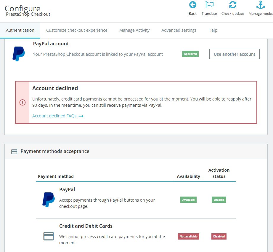 I'm using PrestaShop Checkout (Addon) to connect my store to my paypal account.