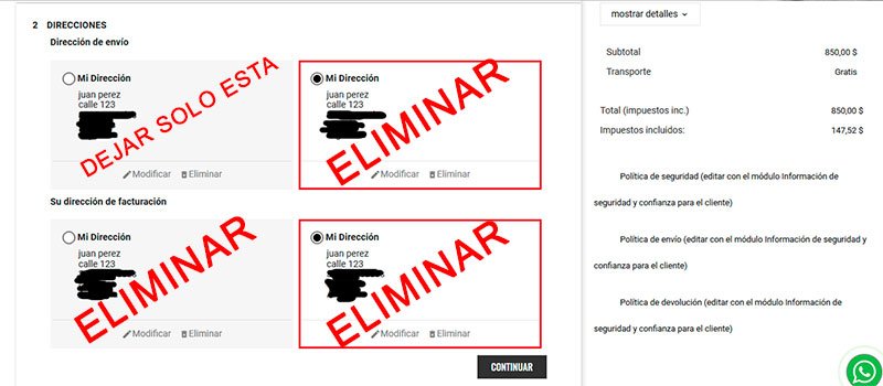 javier Posted October 30, 2020 Share Posted October 30, 2020 hola, tengo una consulta, quisiera saber si es posible y conveniente eliminar una de las dos direcciones de envio y las dos direcciones de facturacion, estuve probando y logré eliminar las direcciones de facturacion pero buscando vi que tambien es necesario modificar /controllers/AuthController.php y /controllers/OrderController.php y no se que lineas editar. En cuanto a las direcciones de envio es necesario editar algun archivo php. Adjunto imagen ilustrativa. Estoy trabajando con PS 1.7.6.5. Gracias Link to comment Share on other sites More sharing options...