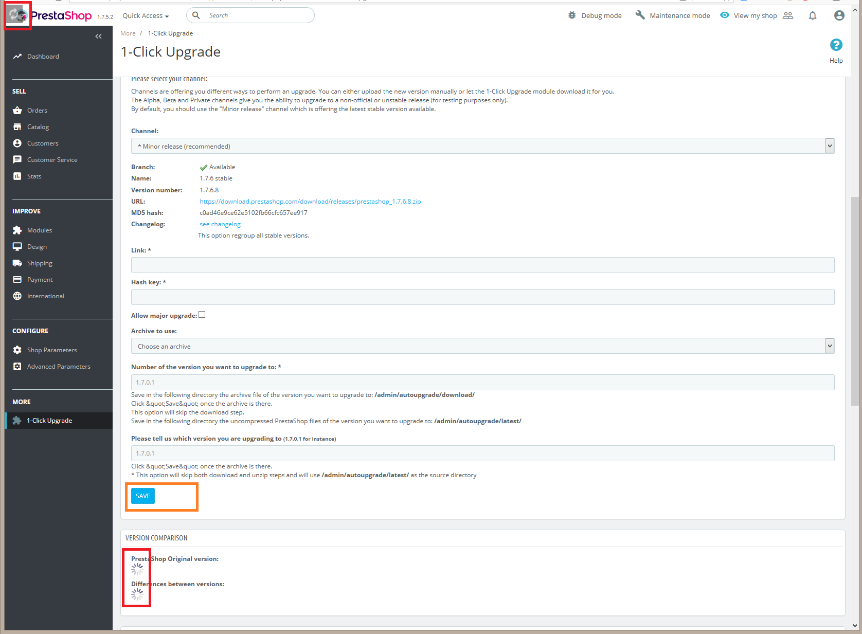 Both attempts was successfull but after this I was about to upgrade on newest version PS 1.7.6.8 and it is not possible. When I choose any CHANNEL to upgrade (Minor release, Local archive, ..) and then click on SAVE [seen screenshot 01 - orange mark] - page is not responding - nothing is saved. So I can't choose any way to upgrade again.