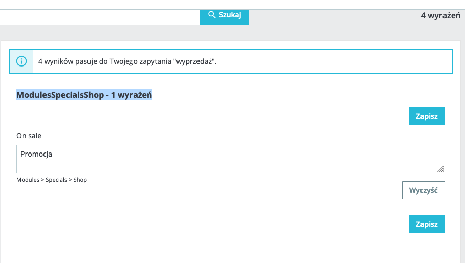 0 rrataj Posted November 4, 2020 Share Posted November 4, 2020 @jukno Jak widzisz na twoje wyszukiwanie wynikiem jest "4 wyrażeń", a z tego co widzę zmieniasz tylko jedno pod "Modules > Specials > Shop". Zmiana tego w preście jest dość nieintuicyjna, musisz wyszukać "Wyprzedaż", a następnie klikać we wszystkie dostępne kategorie i podkategorie po lewej, aż znajdziesz inny tekst do przetłumaczenia. Prawdopodobnie to czego szukasz będzie w "Shop > Theme > Catalog". Link to comment Share on other sites More sharing options...