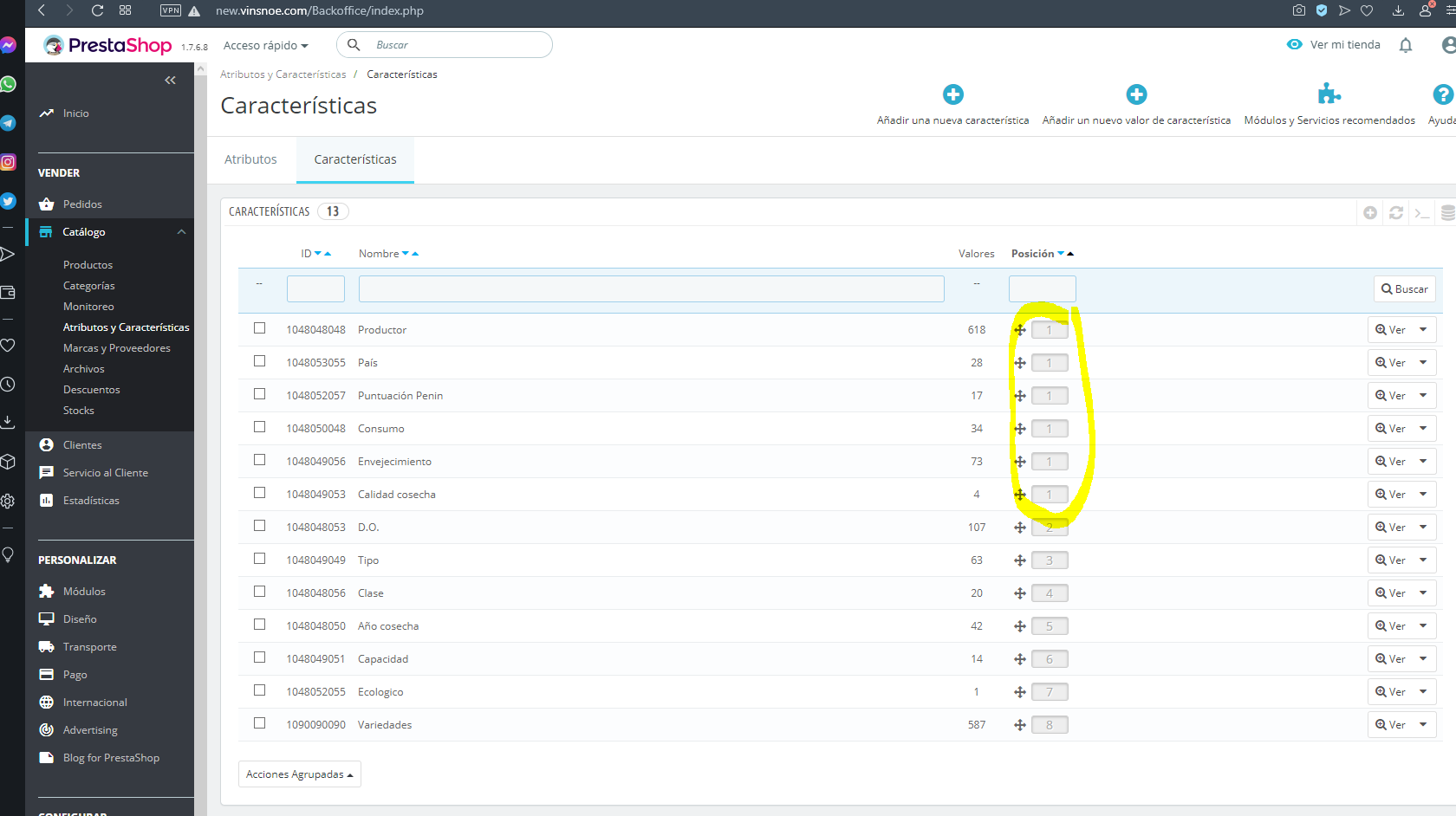 Antakarana Posted November 3, 2020 Share Posted November 3, 2020 Hola a todos En un prestashop 1.7.6.8 con plantilla warehouse en su ultima version, tenemos un problema con el orden de las características en los productos. Cuando voy al backoffice ordeno las caracteristicas en el orden deseado. Cuando hago el cambio de posición sale un mensaje diciendo "cambio aplicado" pero a la hora de la verdad no se está guardando ningun cambio. Así es como lo encuentro por defecto, hay que ver un detalle y es que los primeros campos aparecen con un "1" como valor "posición". En cuanto muevo un campo de posición (por ejemplo el campo D.O. lo he movido a la segunda posición¨)... automaticamente el campo posición recibe valores correctos. Sin embargo, cuando voy al producto no se ve ningun cambio en el orden de los valores... Alguien sabe a qué es debido??? Gracias Link to comment Share on other sites More sharing options...