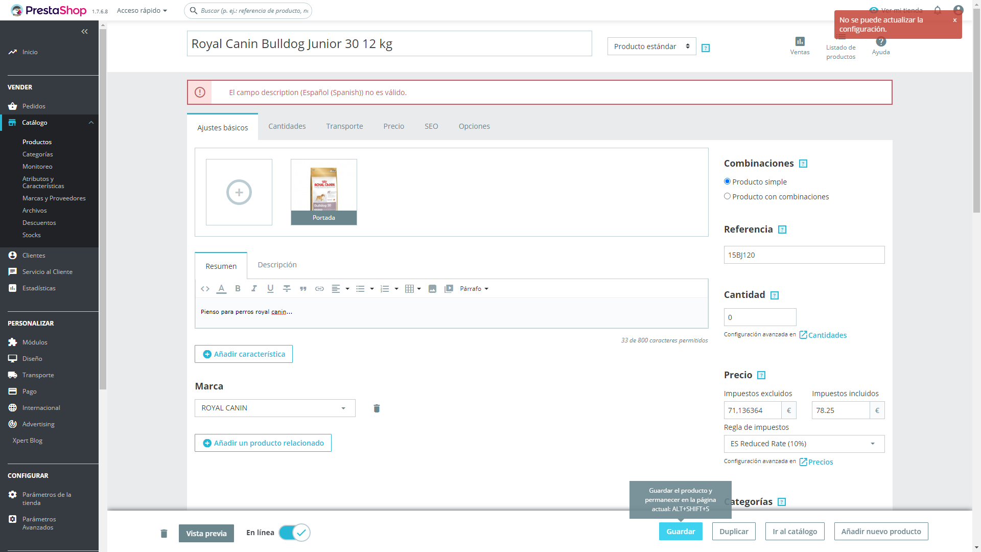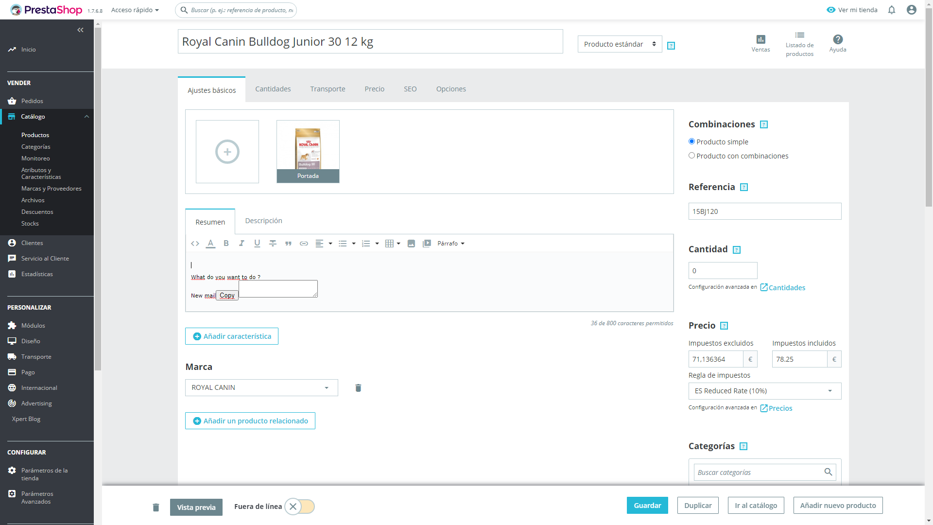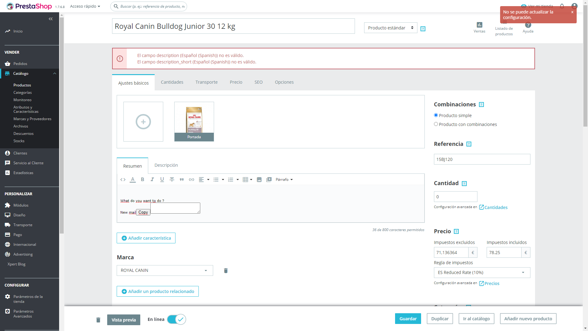 Ismael R. Posted November 12, 2020 Share Posted November 12, 2020 (edited) Hola, tengo un problema en resumen y descripciones tanto de productos como en las categorías me aparece en el campo de descripciones y resumenes lo siguiente : What do hoy yo do? New mail Copy Lo borro ecribo la descripcion y me dice, no se puede actualizar la configuracion y debajo del nombre del producto Descripción del campo (English (Spanish)) no es válido. El campo description_short (English (Spanish)) no es válido. Podria alguien ayudarme dejo capturas, gracias de antemano. Edited November 12, 2020 by Ismael R. (see edit history) Link to comment Share on other sites More sharing options...