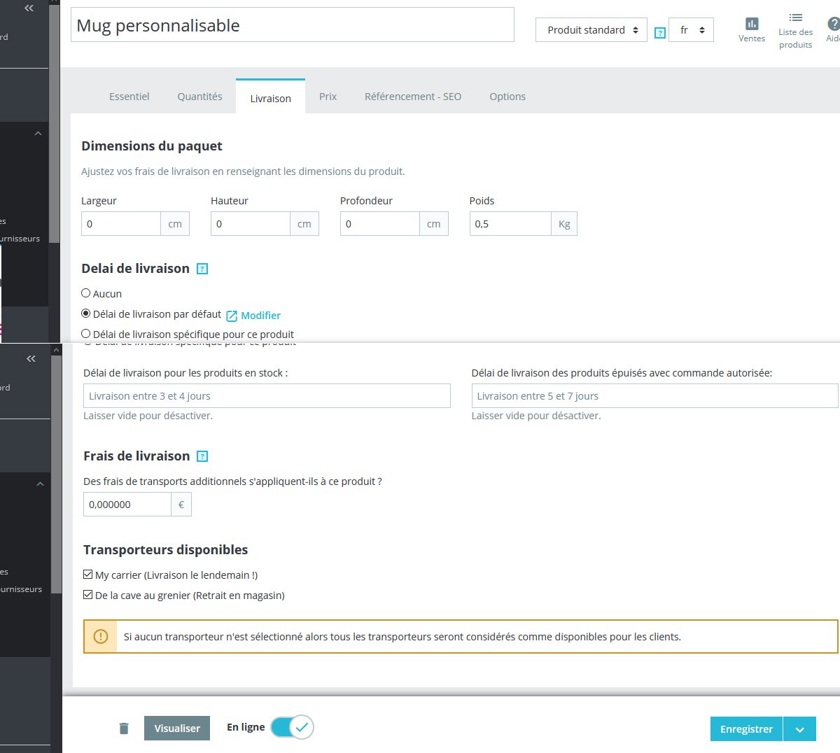 jerrrrrrrry Posted November 18, 2020 Share Posted November 18, 2020 bonjour je cherche a personnaliser la livraison je tente de creer un transporteur neerlandais payant une mise à disposition en magasin gratuite ( ) le site sera situé aux pays bas la je teste en local et j'ai ceci, on voit livraison gratuite😣 mais les deux transporteurs sont crées et actifs hors un seul est affiché sur le front office en plus les options sont pas les bonnes, la livraison devrait etre payante ici recap transporteur de la cave au grenier ici recap my carrier payant dedans j'avais mis ça en options preferences livraisons toutes les zones sont actives zone pays bas les transporteurs sont selectionnés pour le produit merci de votre precieuse aide Link to comment Share on other sites More sharing options...