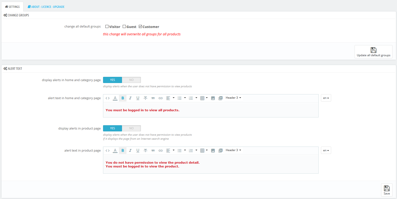 Guest Posted November 21, 2020 Share Posted November 21, 2020 (edited) Module adds product display restrictions for a group of users. Need to hide some products for visitors or guests? The module adds check boxes for all your created user groups in the product detail administration. Checked = visible Unchecked = hidden In the module settings it is possible to change the permissions for all products with one click. If you want to see a message about restricting the visibility of products, you can fill in your own text for both the home page and the product page. Operation is simple. Prestashop version: 1.7.0 > 1.7.7 Language: EN Version: 1.2.4 Buy page: Add product display restrictions for a group of users Licence: one domain (or multistore) Edited November 21, 2020 by Guest (see edit history) Link to comment Share on other sites More sharing options...