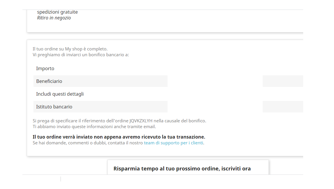 maxi1973 Posted December 12, 2020 Share Posted December 12, 2020 Dovresti modificare il modulo "Bonifico Bancario" ossia modules/ps_wiretransfer e apportare le dovute modifiche affinchè i dati richiesti vengano inseriti nel database e caricati al momento di compilare la conferma ordine. Link to comment Share on other sites More sharing options...