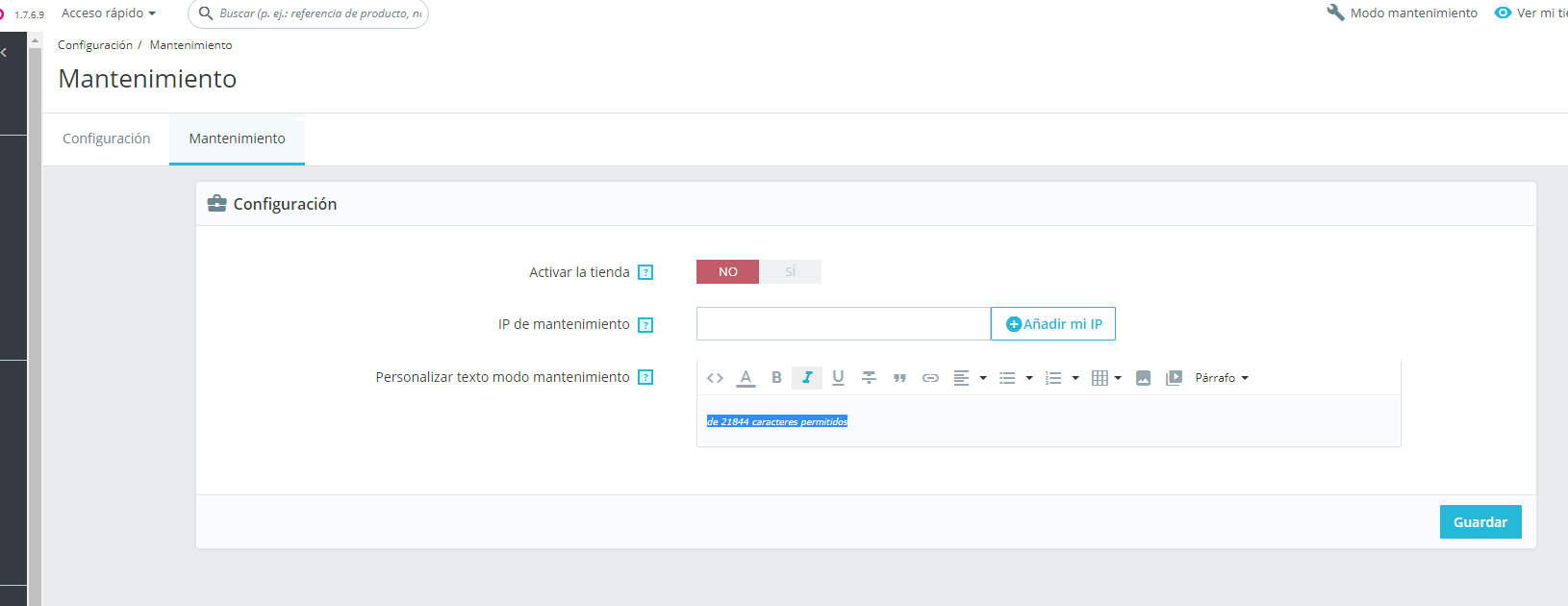 Estos últimos meses he intentado cambiar la pagina de mantenimiento y al momento de guardar no queda ningún registro para mostrar. No se que opción cambiar o que se desconfiguro que no guarda nada. Tengo la versión 1.7.6.9 (sale el texto de "21844 caracteres permitidos" pero al cambiarlo y guardar no sucede nada). Ayuda por favor.