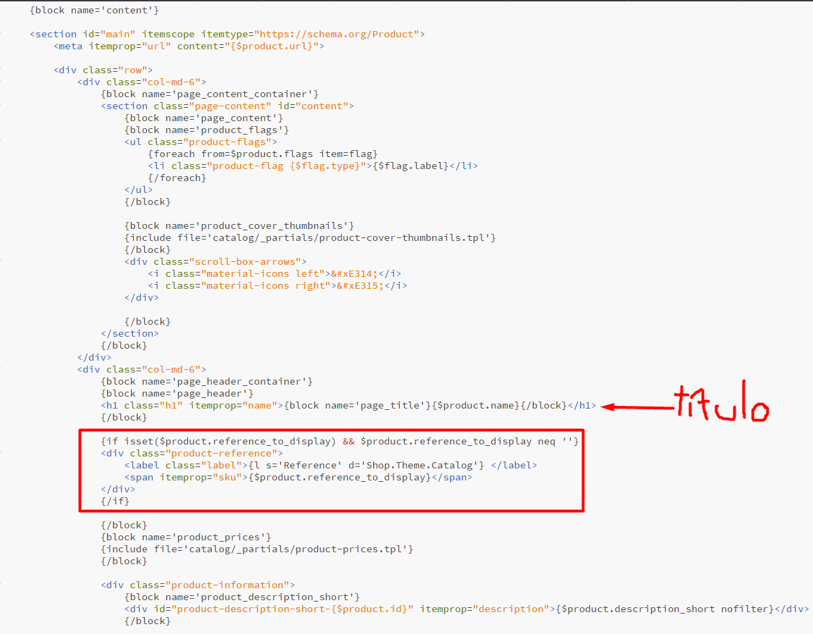 - Ve a themes/classic/templates/catalog/ y abre el archivo product.tpl