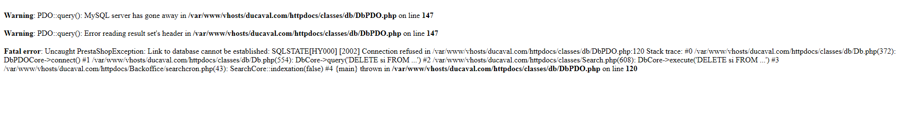 AntonioPerez Posted December 3, 2020 Author Share Posted December 3, 2020 Hola, he habilitado el modo depuración, he vuelto a probar la indexación y me ha devuelto el siguiente error: El error por lo que veo es relacionado con la conexión a la base de datos, no he tocado nada de programación por lo tanto no se por que ahora me devuelve este error y la semana pasada pude hacerlo sin problema. He abierto el fichero en cuestión, he revisado las líneas y no les veo nada raro, las copio por si pudiera servir de ayuda. Línea 120: throw new PrestaShopException('Link to database cannot be established: '.$e->getMessage()); Línea 147: return $this->link->query($sql); Otra cosa que también he probado a sido a desactivar el módulo "Búsqueda por facetas" y hace lo mismo, este módulo justamente me sale para actualizar aunque todavía no lo he hecho. Saludos y gracias Link to comment Share on other sites More sharing options...