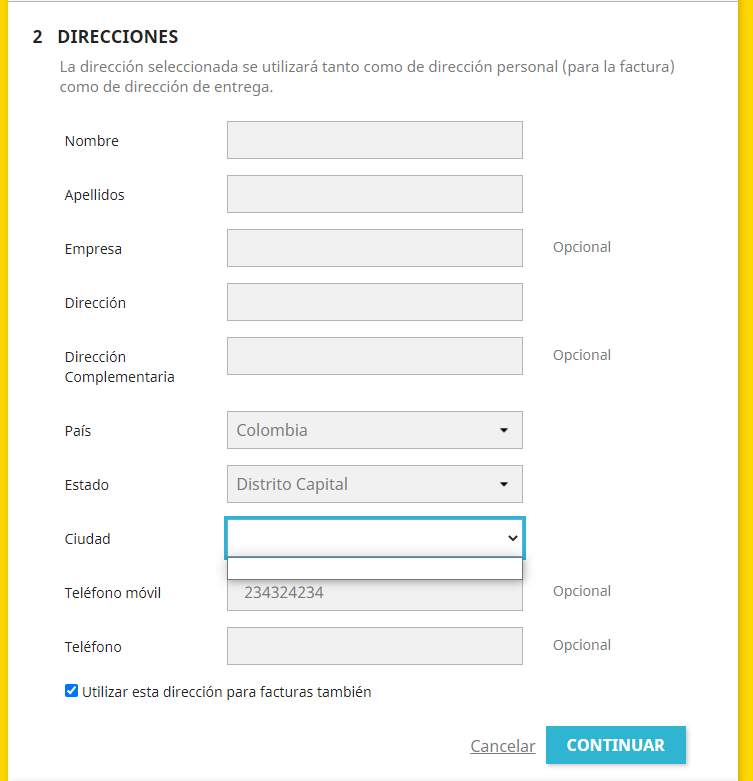 genio813 Posted December 5, 2020 Share Posted December 5, 2020 Buenos días, Estoy usando Prestashop 1.7.7.0 y descargué el paquete de localización de Colombia, el cual me importó todos los departamentos(Provincias) y ciudades de cada estado. El problema es que para el estado Distrito Capital no me aparecé ninguna ciudad, debería aparecer Bogotá y esto hace que desde esa ciudad no se puedan hacer compras. Mi pregunta es, ¿Como agrego una ciudad a una provincia? Link to comment Share on other sites More sharing options...