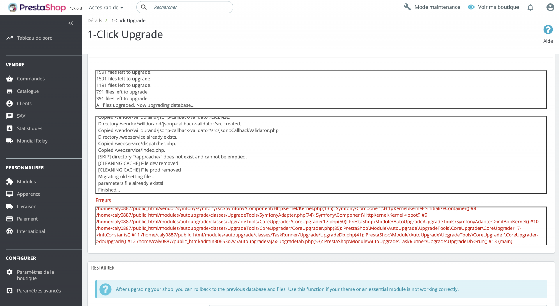 Lynda Posted December 7, 2020 Share Posted December 7, 2020 Bonjour, J'ai voulu mettre à jour ma boutique de la version 1.7.6.3 vers la dernière version 1.7.7 avec 1-Clik Upgrade mais ça a visiblement planté. En PJ une capture d'écran de 1-Click Upgrade à la fin de la mise à jour. J'ai une erreur 500 en back office. Je ne comprends pas les erreurs en rouge. Avez-vous rencontré le même problème ? Merci pour votre aide. Link to comment Share on other sites More sharing options...
