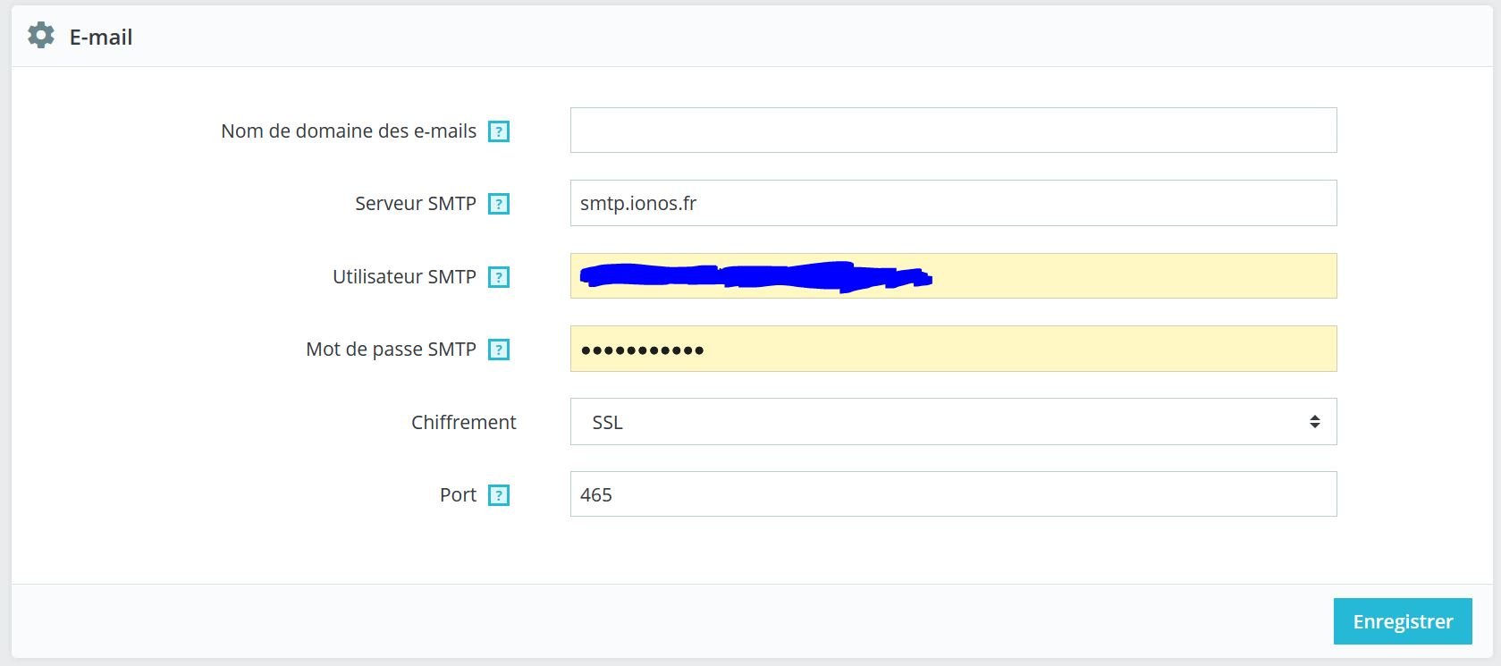 Anthony Moëllo Posted December 22, 2020 Share Posted December 22, 2020 14 hours ago, PierreVin said: Bonjour, Je ne sais pas si cela pourra vous aider, mais j'avais le même message d'erreur et plus aucun mail envoyé de ma boutique. Prestashop 1.7.7 et chez Ionos. Avec la configuration si dessous, c'est revenu à la normale : J'espère que cela pourra vous aider. Bonne journée Bonjour PierreVin, Merci beaucoup pour votre message qui vient effectivement de me permettre de résoudre mon problème d'envoi de mail! Votre solution fonctionne également pour moi. Encore merci pour le partage! Cordialement, Anthony 1 Link to comment Share on other sites More sharing options...