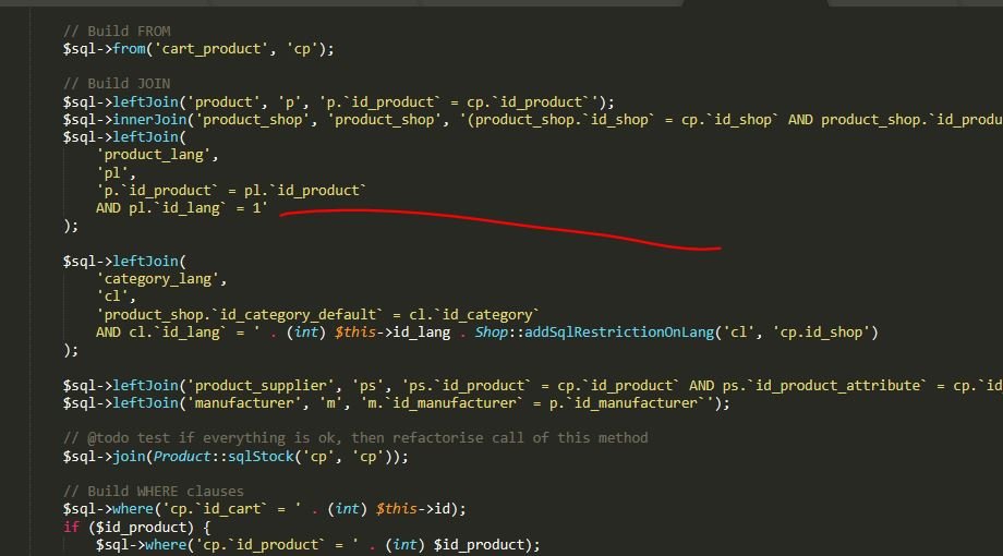 Alexandre Carette Posted December 31, 2020 Share Posted December 31, 2020 sinon dans ton Cart.php tu fais un var_dump($sql); die(); pour voir la requete et tu look ce qu il prend comme id_lang dans le left join de product_lang, cdt Link to comment Share on other sites More sharing options...