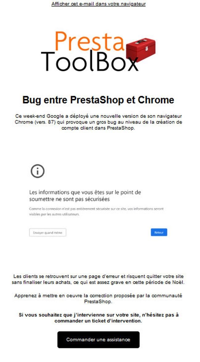 systemil Posted December 14, 2020 Share Posted December 14, 2020 Hello, j'ai remarqué que quelques personnes avaient cette erreur depuis peu lors de la création d'un compte client côté front avec Chrome : Quote Les informations que vous êtes sur le point de soumettre ne sont pas sécurisées J'ai effectué le debug de mon côté que j'explique dans cet article : https://www.ludoc.fr/2020/12/14/les-informations-que-vous-etes-sur-le-point-de-soumettre-ne-sont-pas-securisees-prestashop-1-7/ En attendant un correctif officiel, il est possible de contourner ce problème en modifiant le fichier classes/Tools.php : à la ligne 196, remplacer $use_ssl = !empty($url); par $use_ssl = NULL; J’ai testé rapidement ce correctif mais des effets indésirables ne sont pas impossibles, à utiliser à vos risques et périls 😉 Link to comment Share on other sites More sharing options...