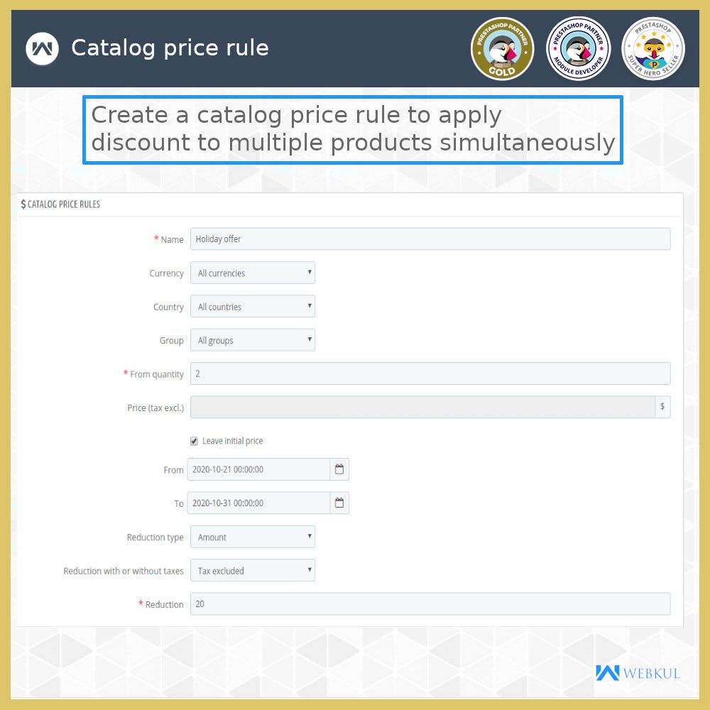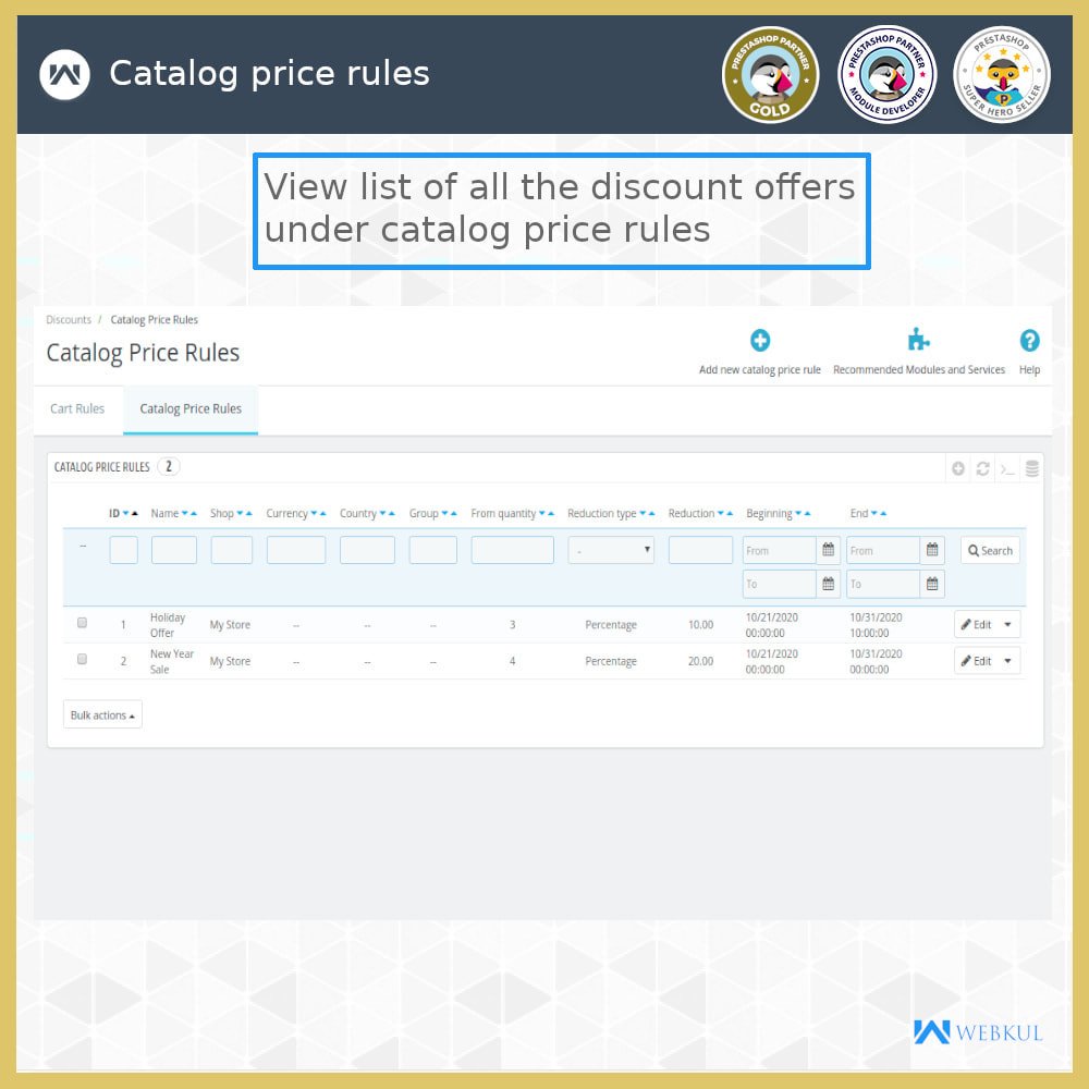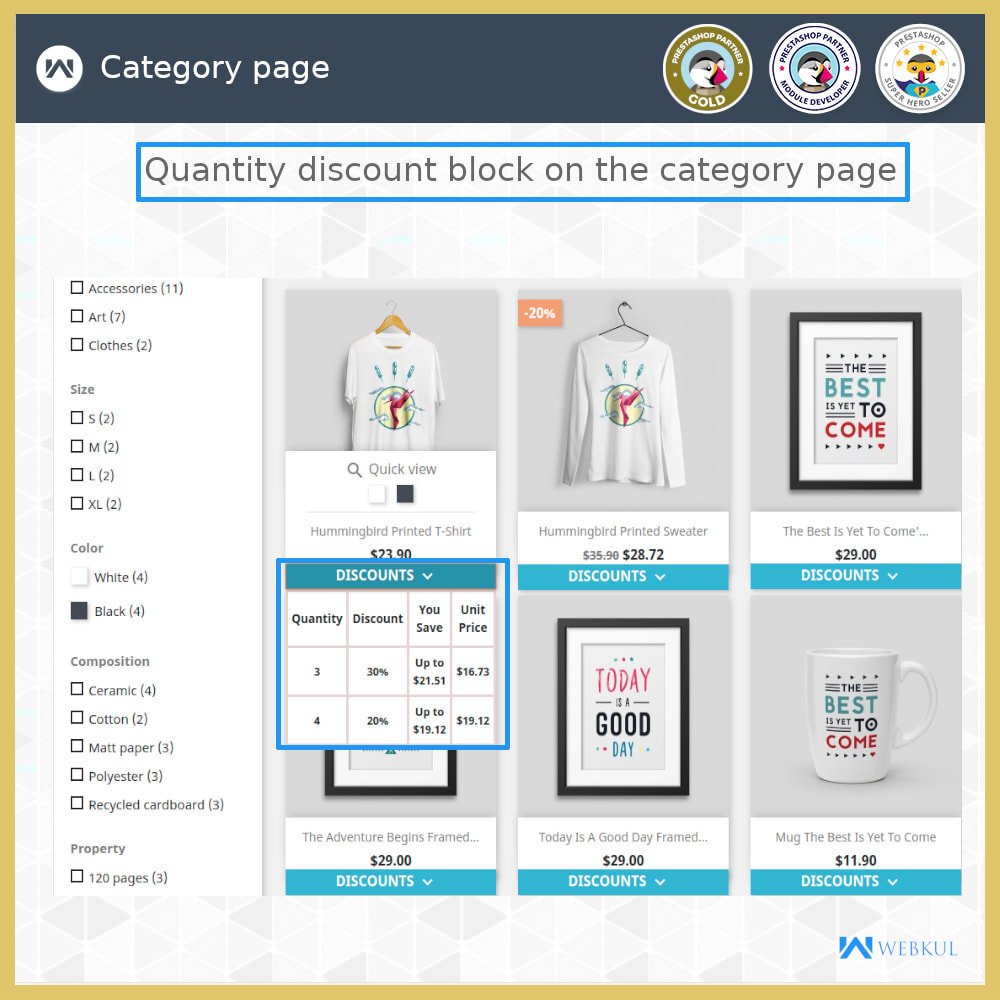 Webkul Modules Posted December 15, 2020 Share Posted December 15, 2020 (edited) Quantity Discount Block Module In the eCommerce domain, discounts are something that many merchants offer to allure potential customers. After all, who doesn’t want attractive discounts on the products? Even if you are a merchant, you must be a customer of some products. And being a customer, there is something that we all would agree. That is, we tend to buy more number of products if the discounts are better with increased quantity. Considering all these factors in mind, we are here with yet another module i.e. Prestashop Quantity Discount Block. The module is designed to show multiple quantity discounts created by you in an organized way on the product page. You would get to know more about other valuable features that comes with it on the upcoming sections. But let’s just see what quantity discounts are & how they help merchants? Suppose you create a quantity discount of 20% & 30% for 3 & 4 quantity of the products. And, the price of the product was $20. Generally, if your customer buys 3 quantities of product, then he will need $60 in the absence of a discount. But, now with quantity discount, he only needs to pay $48( $20*3 = 60 & after 20% discount on $60 = 48$ ). This way not only customer saves by purchasing more quantities but a merchant also makes more money. Live demo link- https://addons.prestashop.com/demo/FO40237.html Module link-https://addons.prestashop.com/en/additional-information-product-tab/50273-quantity-discount-block.html Features of the Quantity Discount Block module- Show or hide the discount block on the product page. Show or hide the unit price of the product after applying a discount on the block. Select the position to show the discount block on the product page. Choose to show the discount block on all the product listing pages or selected pages. Select the product listing pages as per your wish to show discount block on them. Show or hide the unit price of the product after an effective discount in block even on product listing pages. Choose to show or hide discount block on product listing pages for mobile devices. Purchase link https://addons.prestashop.com/en/additional-information-product-tab/50273-quantity-discount-block.html Amit Kushwaha Webkul/ Edited December 15, 2020 by Amit Kushwaha (see edit history) Link to comment Share on other sites More sharing options...