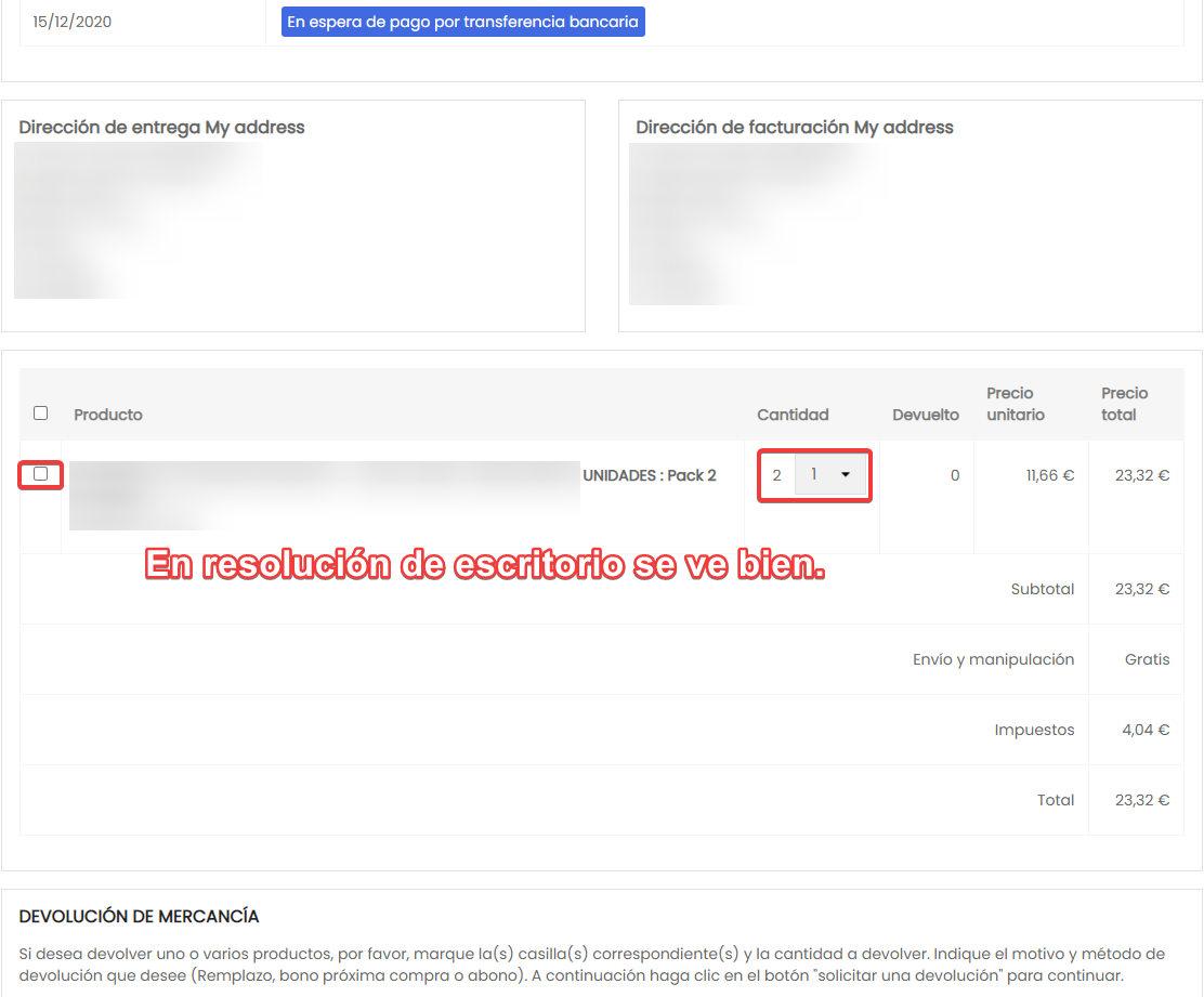 led22 Posted December 15, 2020 Share Posted December 15, 2020 (edited) Buenas tardes, El sistema de devolución de productos que viene por defecto con prestashop (1.7.6.5), funciona medianamente bien, al menos en formato de escritorio. En el formato móvil me esta dando problemas, en la parte que se tiene que indicar el producto a devolver y la cantidad no se muestra. Adjunto capturas: Escritorio Móvil En la resolución móvil no esta ni el checkbox ni el desplegable de las unidades y claro, al darle a "solicitar una devolución", dice que no esta ningún producto seleccionado. Alguien se ha encontrado en la misma situación o puede echar un cable? Alguien conoce algún modulo para devoluciones RMA? He visto uno de Knowband pero no me termina de convencer. Saludos. Edited December 18, 2020 by amellaa (see edit history) Link to comment Share on other sites More sharing options...