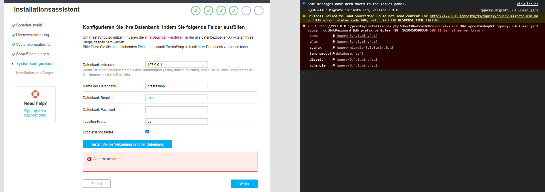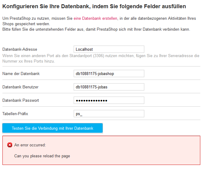 JoBaMediaNauheim Posted December 17, 2020 Share Posted December 17, 2020 Hallo erstmal, ich habe ein Problem bei der Installation von Prestashop beim Installationsassistent im Punkt "Systemkonfiguration". Ich soll dort meine Datenbank konfigurieren, damit sich PrestaShop damit verbinden kann. Ich gebe alle Daten meiner neu erstellen Datenbank an und beim Verbindungstest kommt die nichtssagende Fehlermeldung: "An error occurred Can you please reload the page". Natürlich habe ich die Seite schon sehr oft neugeladen, bekomme diese Meldung aber weiterhin. Egal was ich in die Felder eingebe, diese Meldung kommt immer. Ich habe das auch schon mit einer andere bestehende Datenbank versucht, mit dem gleichen Fehler. Ich habe auch schon mehrere Wochen gewartet, falls die Seite eine Störung hat, was mich aber auch nicht weitergebracht hat. Ich weiß nicht mehr weiter und hoffe daher auf Hilfe von euch. Schonmal Danke im vorraus. JoBaMedia Nauheim Link to comment Share on other sites More sharing options...
