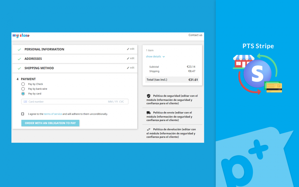 PresTeamShop Posted July 26, 2021 Author Share Posted July 26, 2021 (edited) Hello community, We have launched a new version of our module PTS Stripe PrestaShop 1.7.X v4.0.6 (07/26/2021) - New feature and improvement: - #PTSS-71: New option to enable / disable card payment. - #R-67: Addition of NL, IT, BE and ES countries for payment by Sofort. - #R-67: Now the payment used by the customer is recorded in the order. - #R-67: The transaction within Stripe that gives the description of the store and the order number created. - #R-68: Adding the 'receipt_email' field so that the payment notification arrives to the customer from Stripe. Best regards. Edited August 4, 2021 by PresTeamShop (see edit history) Link to comment Share on other sites More sharing options...
