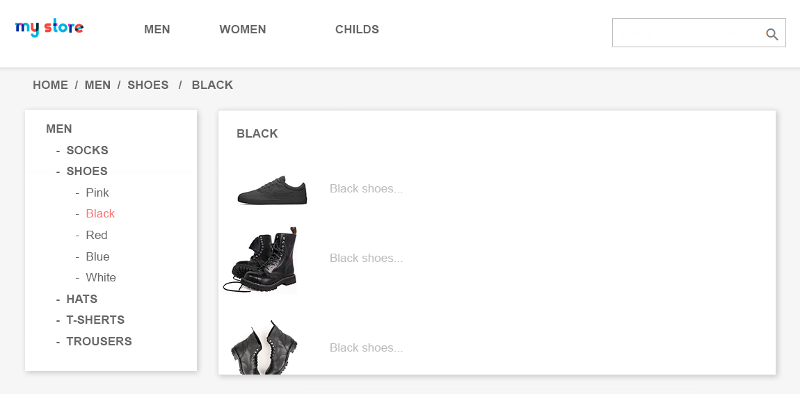 Neve Posted December 24, 2020 Share Posted December 24, 2020 (edited) HI I would like display full category tree for active element on "category page", e.g: Main categories are like: MEN WOMEN CHILDS Active category is "Blach Shoes" for MAN Images with menu simulation are attached. MEN - SOCKS - SHOES - Pink - Black - Red - Blue - White - HATS - T-SHERTS - TROUSERS How to do this?? Edited December 24, 2020 by Neve (see edit history) Link to comment Share on other sites More sharing options...