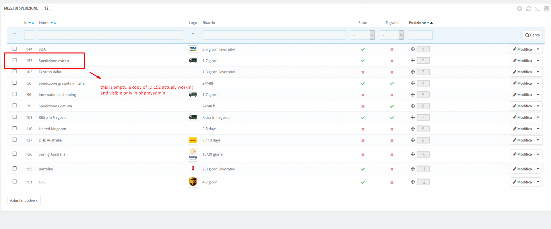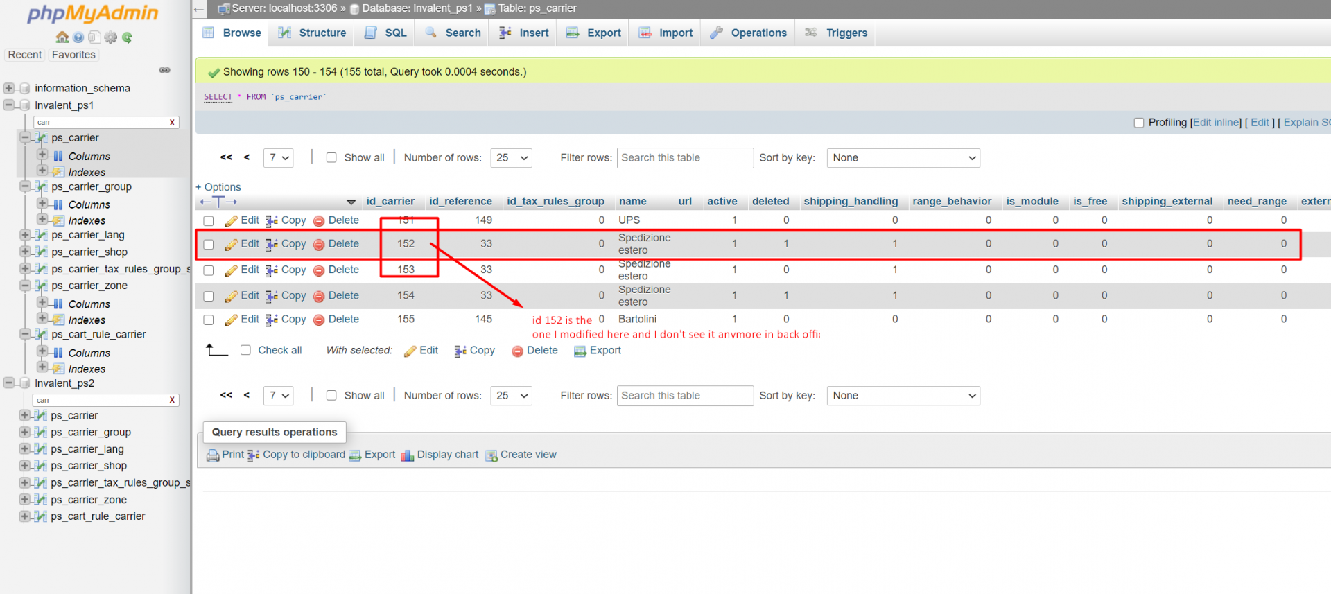 But today in back office I cannot find this carrier anymore. I find only an empty copy if this carrier, with ID 153 (the next to 152, which is the original one and still working and visible in the phpmyadmin table).