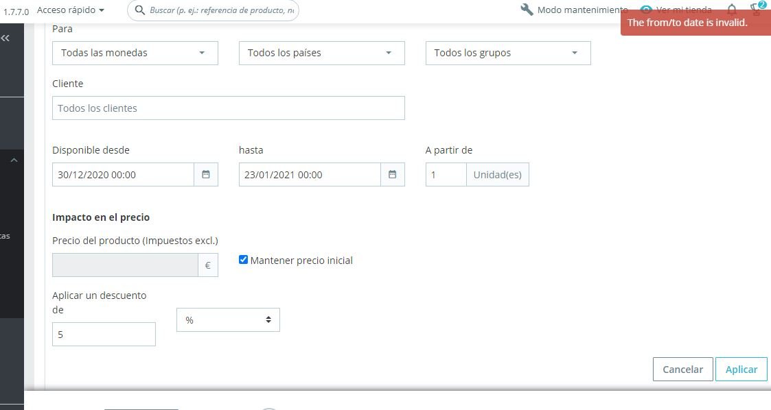 Rise Posted December 30, 2020 Share Posted December 30, 2020 Hola, Tengo problema al crear un precio específico a productos individuales, al parecer es el selector de fechas, predeminado vien Y/m/d pero cuando elijo en el calendario aparece d/m/Y H/m y entonces me salta error al aplicar indicando the from/to date is invalid. ¿Alguien sabe sobre el tema? ¿Dónde podria corregir el calendario? que creo que es el problema. Solo me ocurre cuando creo precio específico para producto individual, cuando creo un descuento por catálogo no me da problema y al selecionar fecha sale con el formato Y/m/d. Adjunto capturas. Gracias de antemano. Link to comment Share on other sites More sharing options...