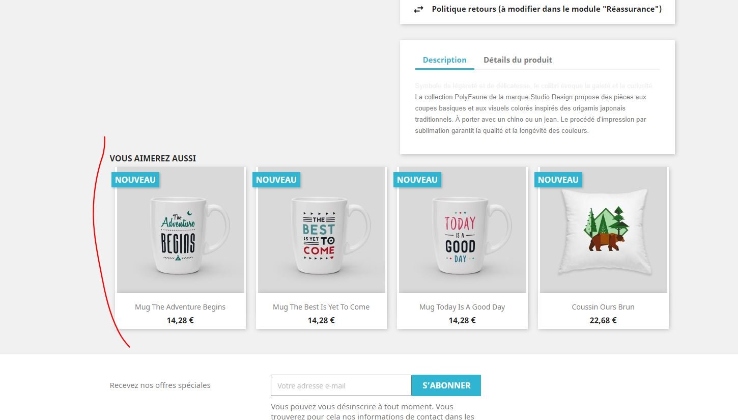 Alexandre Carette Posted January 8, 2021 Share Posted January 8, 2021 (edited) Ok du coup je t'ai fais la fonctionnalité: http://demo1750.baba-agency.com/hommes/1-1-hummingbird-printed-t-shirt.html je me suis basé sur le code du module ps_featured 1- on crée un override de Category.php /override/classes <?php /** * 2007-2018 PrestaShop. * * NOTICE OF LICENSE * * This source file is subject to the Open Software License (OSL 3.0) * that is bundled with this package in the file LICENSE.txt. * It is also available through the world-wide-web at this URL: * https://opensource.org/licenses/OSL-3.0 * If you did not receive a copy of the license and are unable to * obtain it through the world-wide-web, please send an email * to [email protected] so we can send you a copy immediately. * * DISCLAIMER * * Do not edit or add to this file if you wish to upgrade PrestaShop to newer * versions in the future. If you wish to customize PrestaShop for your * needs please refer to http://www.prestashop.com for more information. * * @author PrestaShop SA <[email protected]> * @copyright 2007-2018 PrestaShop SA * @license https://opensource.org/licenses/OSL-3.0 Open Software License (OSL 3.0) * International Registered Trademark & Property of PrestaShop SA */ use PrestaShop\PrestaShop\Core\Module\WidgetInterface; use PrestaShop\PrestaShop\Adapter\Category\CategoryProductSearchProvider; use PrestaShop\PrestaShop\Adapter\Image\ImageRetriever; use PrestaShop\PrestaShop\Adapter\Product\PriceFormatter; use PrestaShop\PrestaShop\Core\Product\ProductListingPresenter; use PrestaShop\PrestaShop\Adapter\Product\ProductColorsRetriever; use PrestaShop\PrestaShop\Core\Product\Search\ProductSearchContext; use PrestaShop\PrestaShop\Core\Product\Search\ProductSearchQuery; use PrestaShop\PrestaShop\Core\Product\Search\SortOrder; class Category extends CategoryCore { public function getProductsByIdCategory($id_category,$nProducts) { $context = Context::getContext(); $category = new Category((int)$id_category); $searchProvider = new CategoryProductSearchProvider( $context->getTranslator(), $category ); $context = new ProductSearchContext($context); $query = new ProductSearchQuery(); if ($nProducts < 0) { $nProducts = 12; } $query ->setResultsPerPage($nProducts) ->setPage(1) ; if (Configuration::get('HOME_FEATURED_RANDOMIZE')) { $query->setSortOrder(SortOrder::random()); } else { $query->setSortOrder(new SortOrder('product', 'position', 'asc')); } $result = $searchProvider->runQuery( $context, $query ); $context = Context::getContext(); $assembler = new ProductAssembler($context); $presenterFactory = new ProductPresenterFactory($context); $presentationSettings = $presenterFactory->getPresentationSettings(); $presenter = new ProductListingPresenter( new ImageRetriever( $context->link ), $context->link, new PriceFormatter(), new ProductColorsRetriever(), $context->getTranslator() ); $products_for_template = []; foreach ($result->getProducts() as $rawProduct) { $products_for_template[] = $presenter->present( $presentationSettings, $assembler->assembleProduct($rawProduct), $context->language ); } return $products_for_template; } } 2 - dans le product.tpl /themes/classic/templates/catalog/ {* Modif Alex *} {assign var=productsCustom value=Category::getProductsByIdCategory(6,4)} <section class="product-accessories clearfix"> <p class="h5 text-uppercase">{l s='You might also like' d='Shop.Theme.Catalog'}</p> <div class="products"> {foreach from=$productsCustom item="product_custom"} {block name='product_miniature'} {include file='catalog/_partials/miniatures/product.tpl' product=$product_custom} {/block} {/foreach} </div> </section> {* Modif Alex *} Category::getProductsByIdCategory(6,4) le 1er parametre est la categorie qu'on target id 6 dans cet exemple, le deuxieme parametre le nombre de produits que l'on souhaite afficher ici 4 cdt Edited January 8, 2021 by Alexandre Carette (see edit history) Link to comment Share on other sites More sharing options...