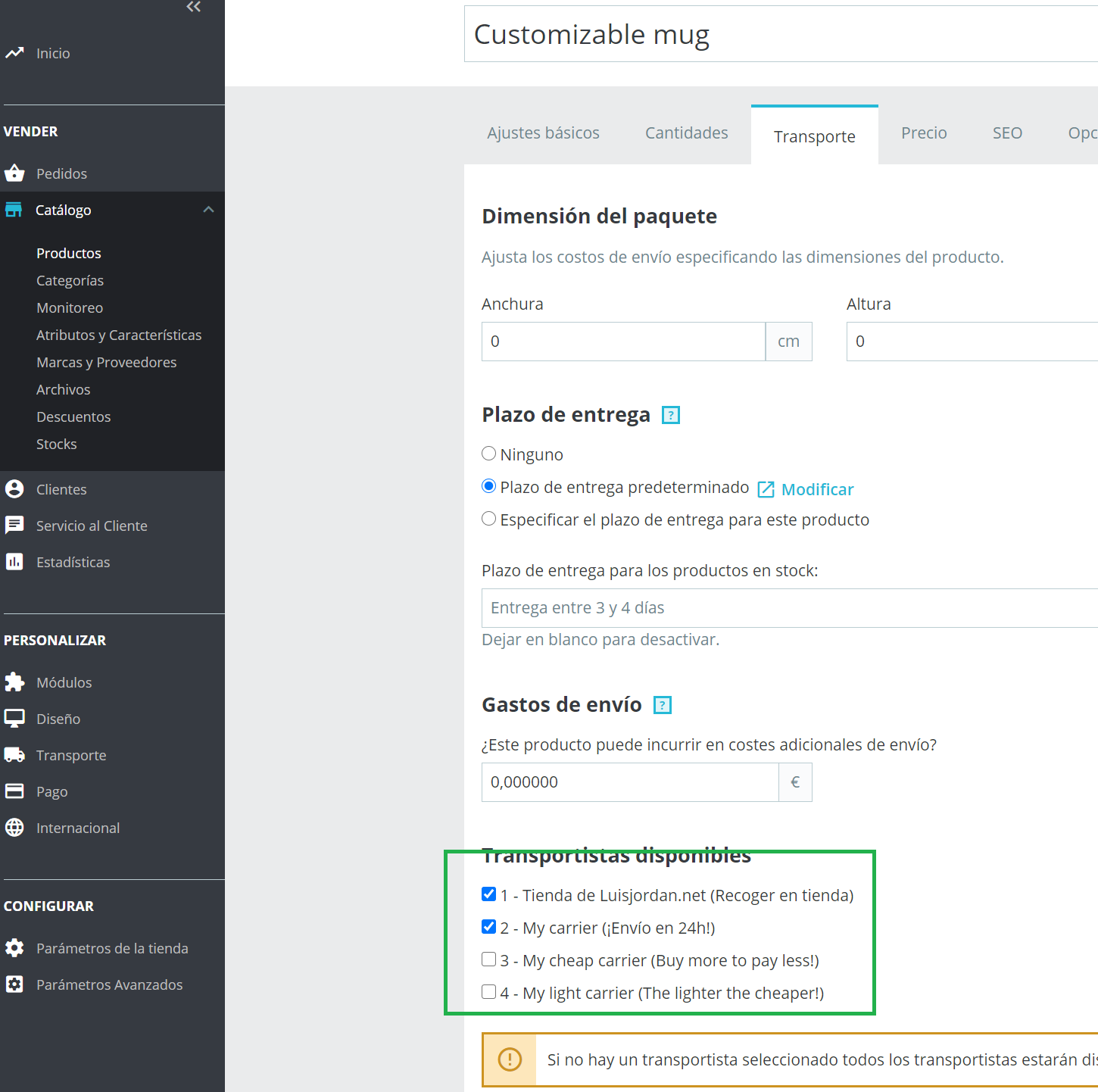 Luisejo Posted January 9, 2021 Share Posted January 9, 2021 Hola @rhhotelsupply Creo haber entendido bien lo que comentas, y si, eso se puede hacer. Dentro de cada producto, puedes seleccionar 1 o varios transportistas. En el caso de los productos que quieras limitar a Canarias, define un transportista que solo entregue en Canarias y asígnalo a los productos que desees sin añadir ningún otro transportista. Link to comment Share on other sites More sharing options...