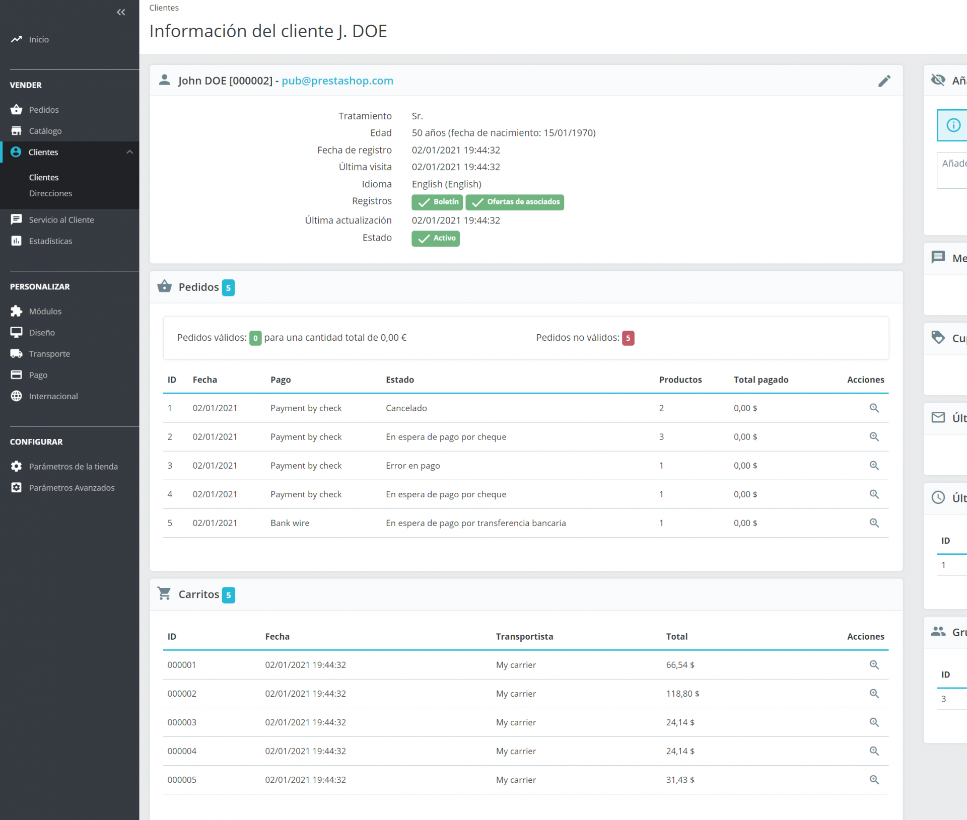 Luisejo Posted January 9, 2021 Share Posted January 9, 2021 Hola @Aldeag Contestando a tu pregunta, si. Para ello, te recomiendo que vayas a la sección del panel de administración de tu tienda: Clientes: Clientes. En esta sección puedes encontrar lo que ha solicitado cada cliente, fechas de pedidos, carritos, etc. Dentro de cada pedido, puedes pulsar sobre la 'lupa' de acciones y ver el detalle del mismo. Espero que esta información te sea de utilidad. Saludos. Link to comment Share on other sites More sharing options...