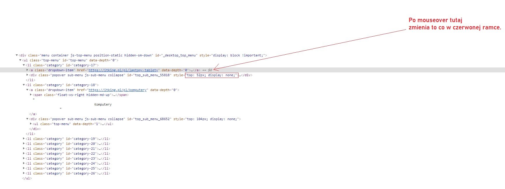 Rozwinięcie problemu na obrazie poniżej. Nie znalazłem odwołania do klasy dorpdown-item ani id top_sub_menu_xxxx w js-ach. Gdybym znalazł to wklepałbym na sztywno 0px i byłoby po problemie. Ewidentnie oblicza top-a od rodzica. Nie znalazłem nawet miejsca zmiany stylu display bo jego też js modyfikuje. Podejrzewałem jquery-ui.min.js ale nie jest zbyt czytelny. Natomiast są tam jakieś obliczenia na zmiennych a,b,e,f,g w stylu setoffsetTop ale nie wiadomo co do czego. Oczywiście nie ma tam żadnych funkcji które mógłbym bezpośrednio powiązać z tematem.