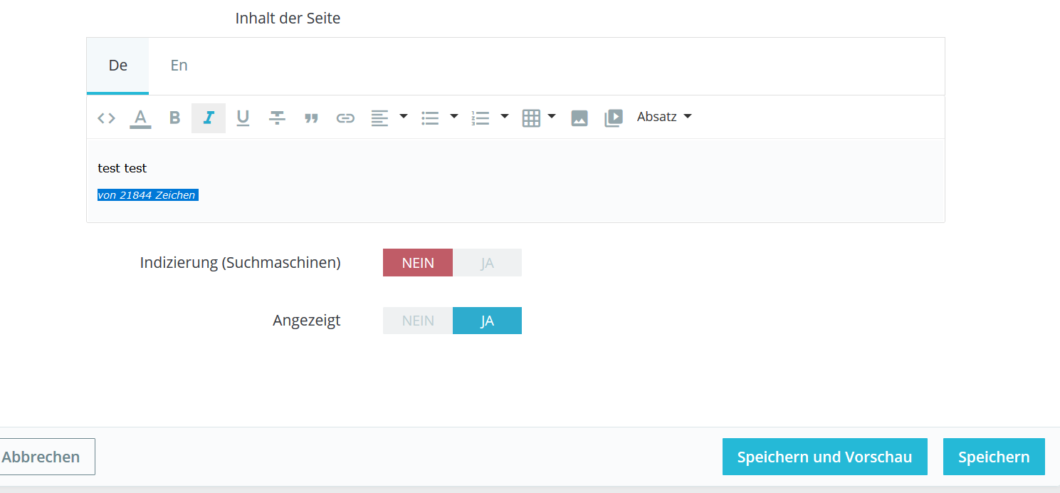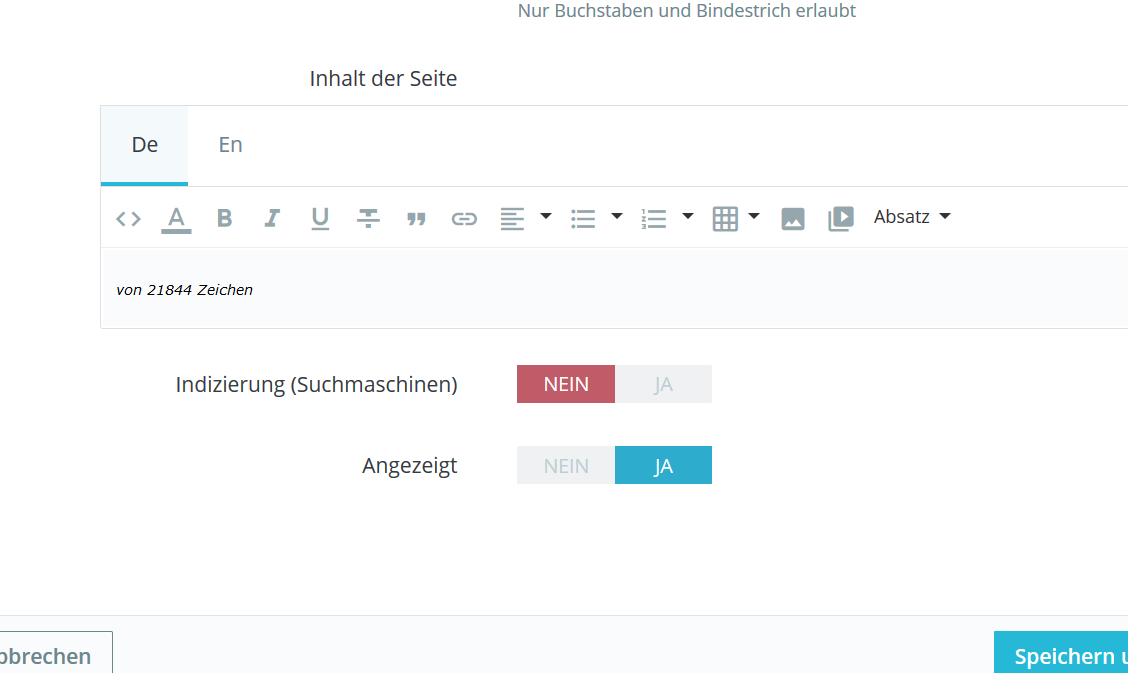 MJx Posted January 9, 2021 Share Posted January 9, 2021 (edited) Hallo miteinander! Ich habe Version 1.7.6.5. Wenn ich unter Design-Seiten eine neue Seite erstellen möchte, habe ich folgendes Problem: Ich gebe unter "Inhalt der Seite" einen Text ein, klicke auf Speichern, es erscheint in grün "Update durchgeführt", dann ist dieser eingegebene Inhalt aber wieder verschwunden. Das geht sogar so weit, dass der Inhalt einer bereits bestehenden Seite verschwindet, wenn ich diese bearbeite. Kann mir da jemand helfen? Ich bin schon recht verzagt. Edited January 9, 2021 by MJx (see edit history) Link to comment Share on other sites More sharing options...