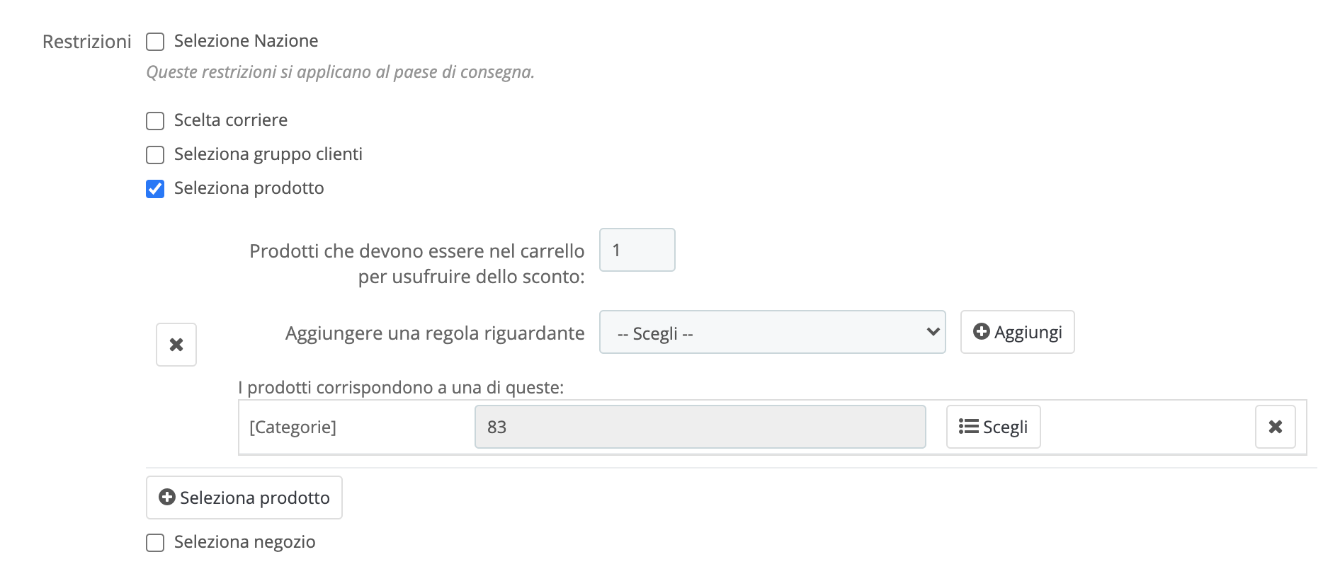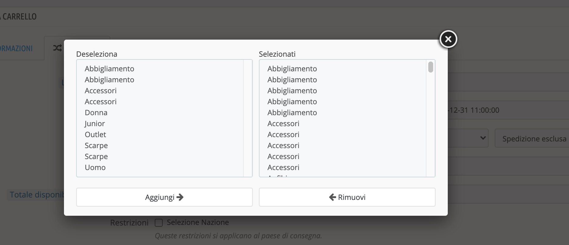 Salve. Ho creato un buono sconto che dovrebbe essere valido per l'intero catalogo, tranne che per una categoria, ma funziona invece su tutto. All'interno di Catalogo->Buoni sconto, è così configurato: