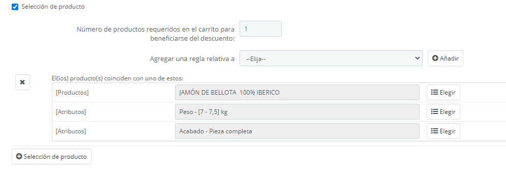 Y por lo que he leído sobre las reglas de carrito para que se aplique al producto debe cumplir todos los requisitos que se ponen, no solo uno de ellos, es decir solo se debe aplicar a producto seleccionado que cumpla los dos atributos.