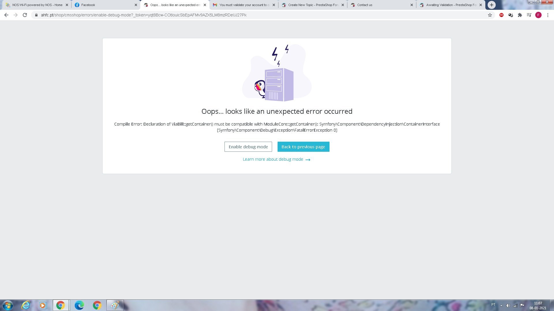 Fernando Conceição Posted January 21, 2021 Share Posted January 21, 2021 Hi I did a update on presta shop to 1.7 and after the update i get the page in attached.I click on debug mode and nothing happens . im stuck here can´t go inside the control panel to revert the update. Im a little disappointed with the help of this software and i will not pay 100 euros for a technical assistance as i was starting the develop of the product, prefer to change the service. any help?! Link to comment Share on other sites More sharing options...
