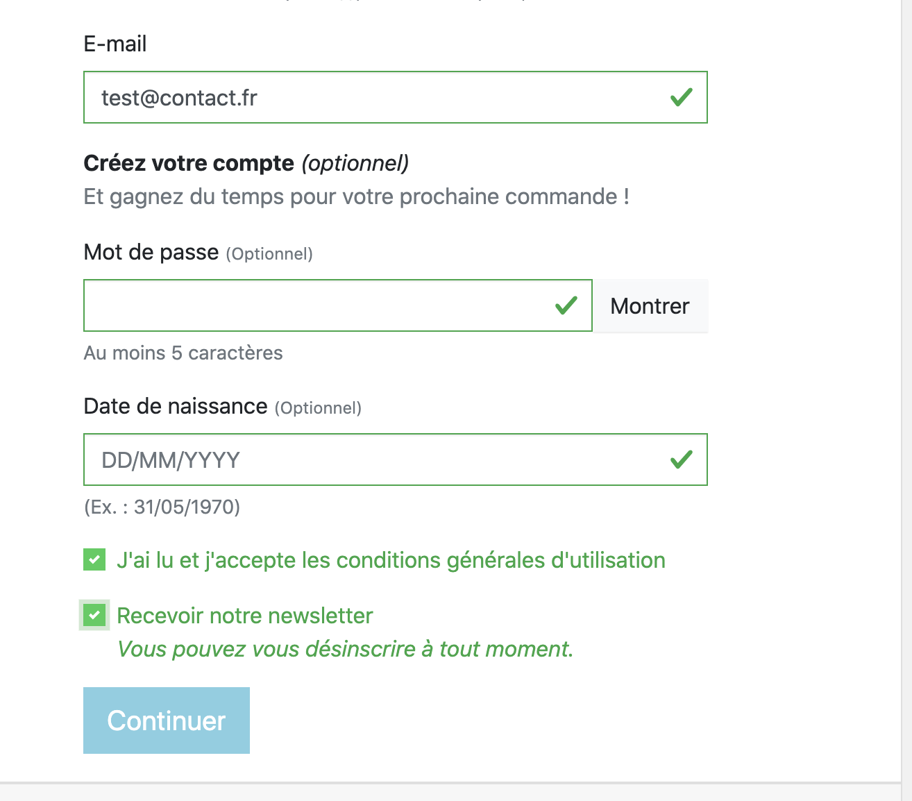 Sur la page commande (panier), lorsqu'un internaute ajoute ses coordonnées mais oublie un champ obligatoire et clique sur "CONTINUER"  les champs obligatoires se mettent en rouge (jusqu'ici tout est normal). Du coup, l'internaute renseigne les champs manquants, et à partir de là, le bouton "CONTINUER" n'est plus cliquable...