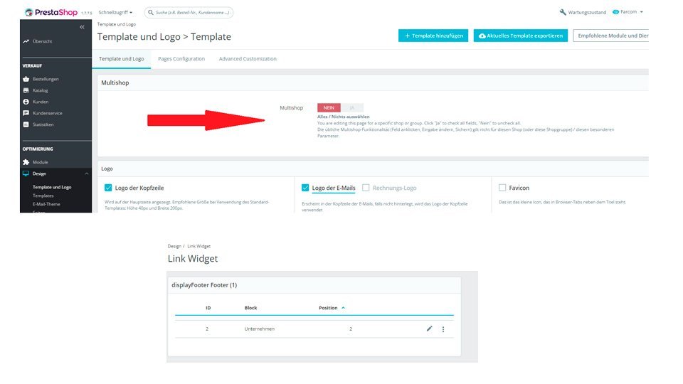 Ich kenne mich leider mit der Multishop-Funktion überhaupt nicht aus. Mir ist jetzt auch nicht klar, was das NEIN oder JA unter "Multishop" denn nun bewirkt, die halb englische, halb deutsche Erklärung klingt auch recht wirr. Ich könnte mir das so vorstellen, daß man hier einstellt ob die einzelnen Multishops das gleiche oder unterschiedliche Themes und Logos haben und das könnte dann vielleicht auch weitere Auswirkungen z. B. auf den Footer haben, hast du probiert hier auf JA zu stellen?