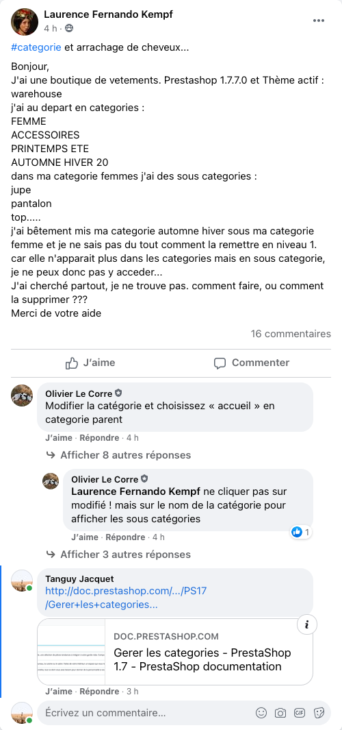 Mediacom87 Posted February 3, 2021 Share Posted February 3, 2021 Il y a 4 heures, Remy FRK Corp a dit : Bonjour. Entrez dans la catégorie, normalement vous avez un menu "catégorie parente" Tu viens de perdre ton temps à chercher une réponse à apporter à cette personne qui n'a pas pris la peine de venir ici exposer la solution que quelqu'un lui a donné ailleurs parce que tu comprends c'était déjà tellement compliqué de lire la documentation que venir clôturer les multiple demande d'aide était sur humain pour elle. Franchement ils me dégoutent de plus en plus et ne font que confirmer la mort de l'open source et des communauté d'entraide. Link to comment Share on other sites More sharing options...