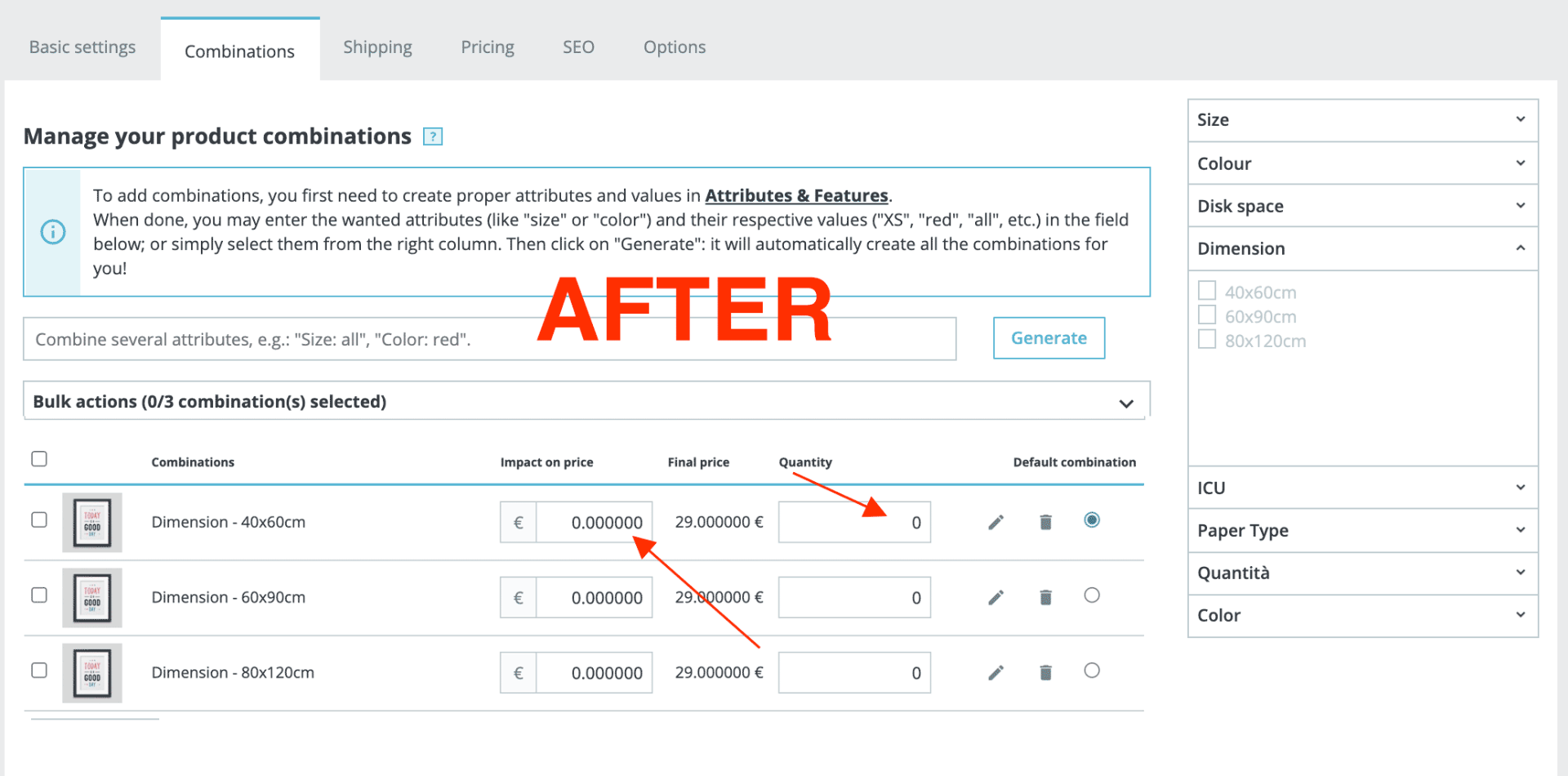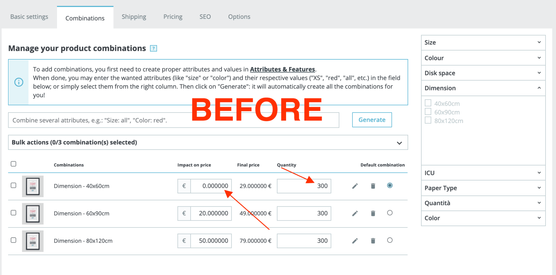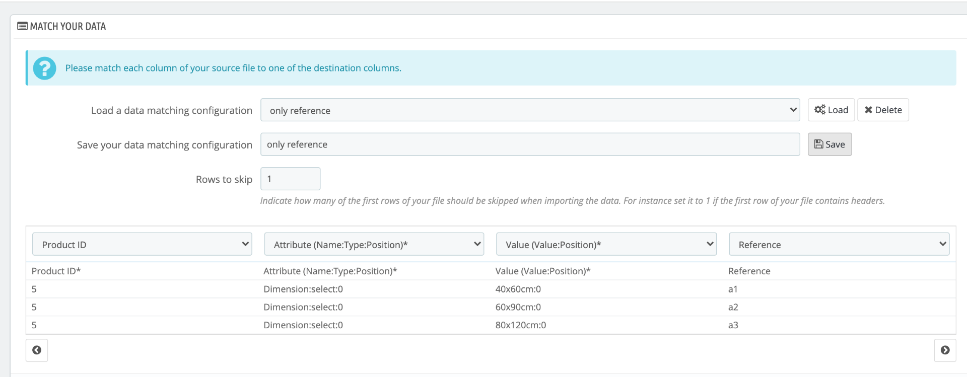 ballashop Posted February 3, 2021 Share Posted February 3, 2021 Ciao, ho scaricato il file csv delle combinazioni per effettuare dei test. combinations_import.csv combinations_import.csv Ho modificato il file in maniera da fare un test su di un prodotto esistente nella demo di PS. import with only reference.csv import with only reference.csv L'obbiettivo è quello di modificare il seguente prodotto che ha 3 combinazioni L'import viene eseguito senza problemi, ma una volta caricati i dati mi sono accorto che PS ha effettuato una sovrascrittura di alcuni campi non richiesti come la quantità e l'impatto del prezzo. Questi campi erano stati ignorati durante il caricamento ma PS ha comunque eseguito una sorta di reset degli stessi. Prima dell'import le 3 combinazioni avevano i seguenti dati: Dopo l'import i dati si sono azzerati: Come scritto sopra, il file csv non conteneva le colonne quantity e impact on price, come da immagine sottostante, le uniche colonne importate erano Product ID | Attribute (Name:Type:Position)* | Value (Value:Position)* | Reference : Eppure dopo l'import, sia l'impatto del prezzo che la quantità si sono azzerati. Un saluto ciao. Balla Link to comment Share on other sites More sharing options...